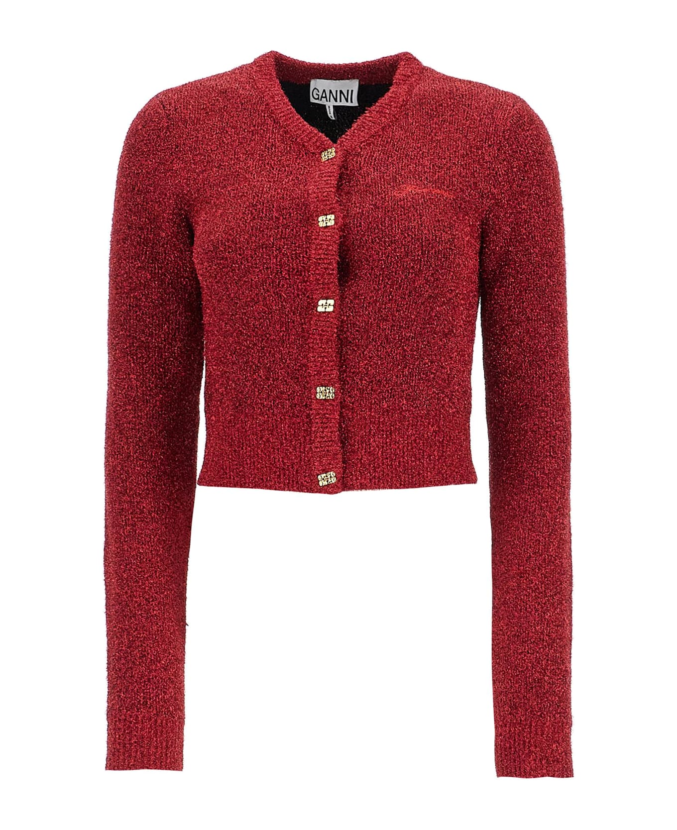 This Ganni cardigan is made of a wool lurex blend and features a V-neckline, ribbed edges, and front closure with gold Butterfly buttons. It has a regular fit and the model is 177 cm tall and wears size XS. Composition: 38% WO, 34% metallic PL, 25% REC PL, 3% PA