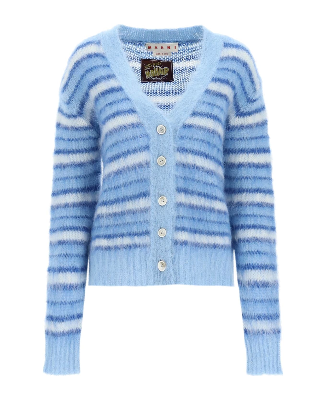 Marni V-neck cardigan in soft mohair blend knit, decorated with a striped motif and finished with ribbed trims. Boxy fit. The model is 177 cm tall and wears a size IT 40. Composition: 67%WM, 28%PA, 5%WO