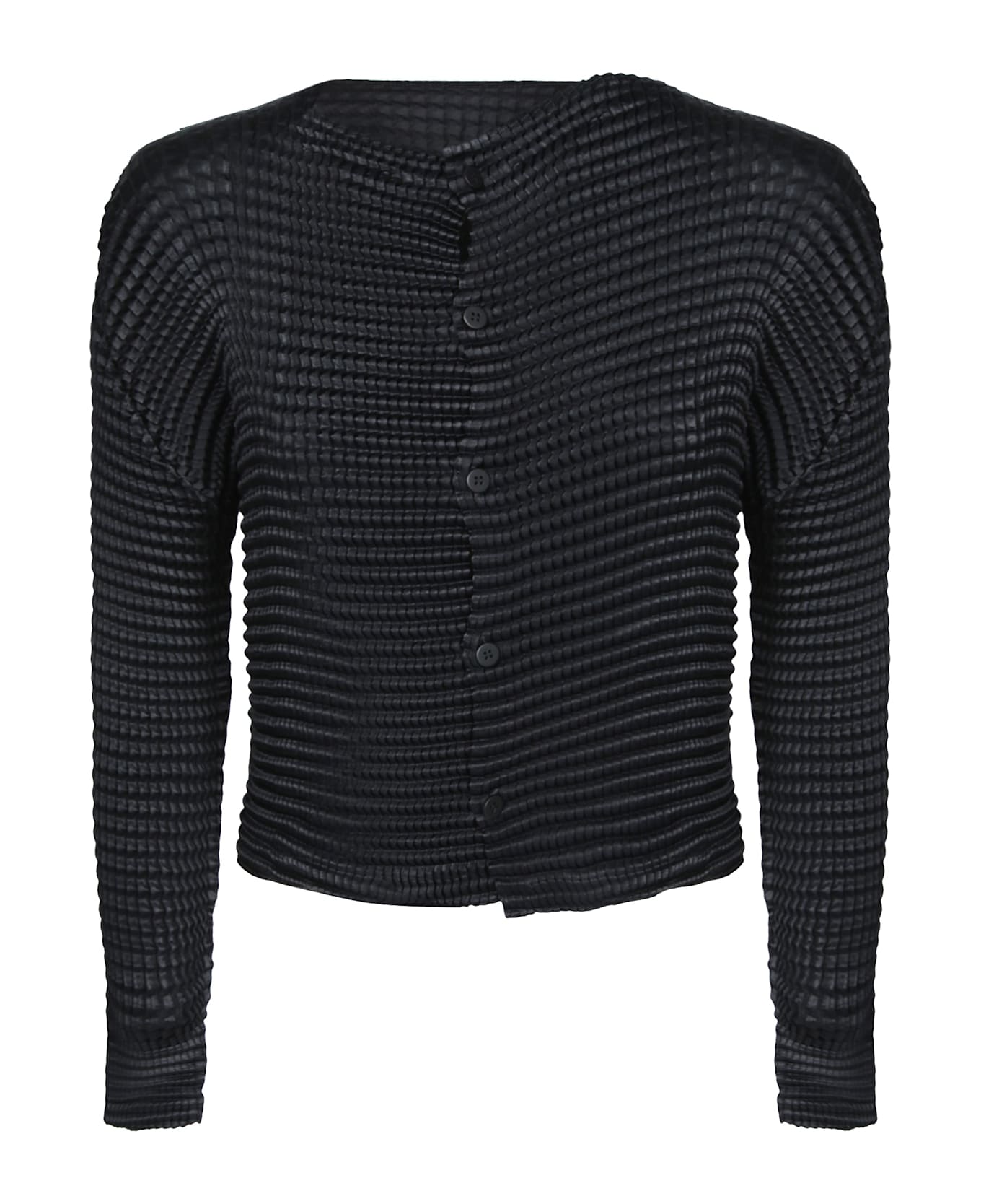Explore structured elegance with the Suede-Like Pleats Black Cardigan by Issey Miyake, featuring an innovative pleated fabric design for a captivating three-dimensional effect.