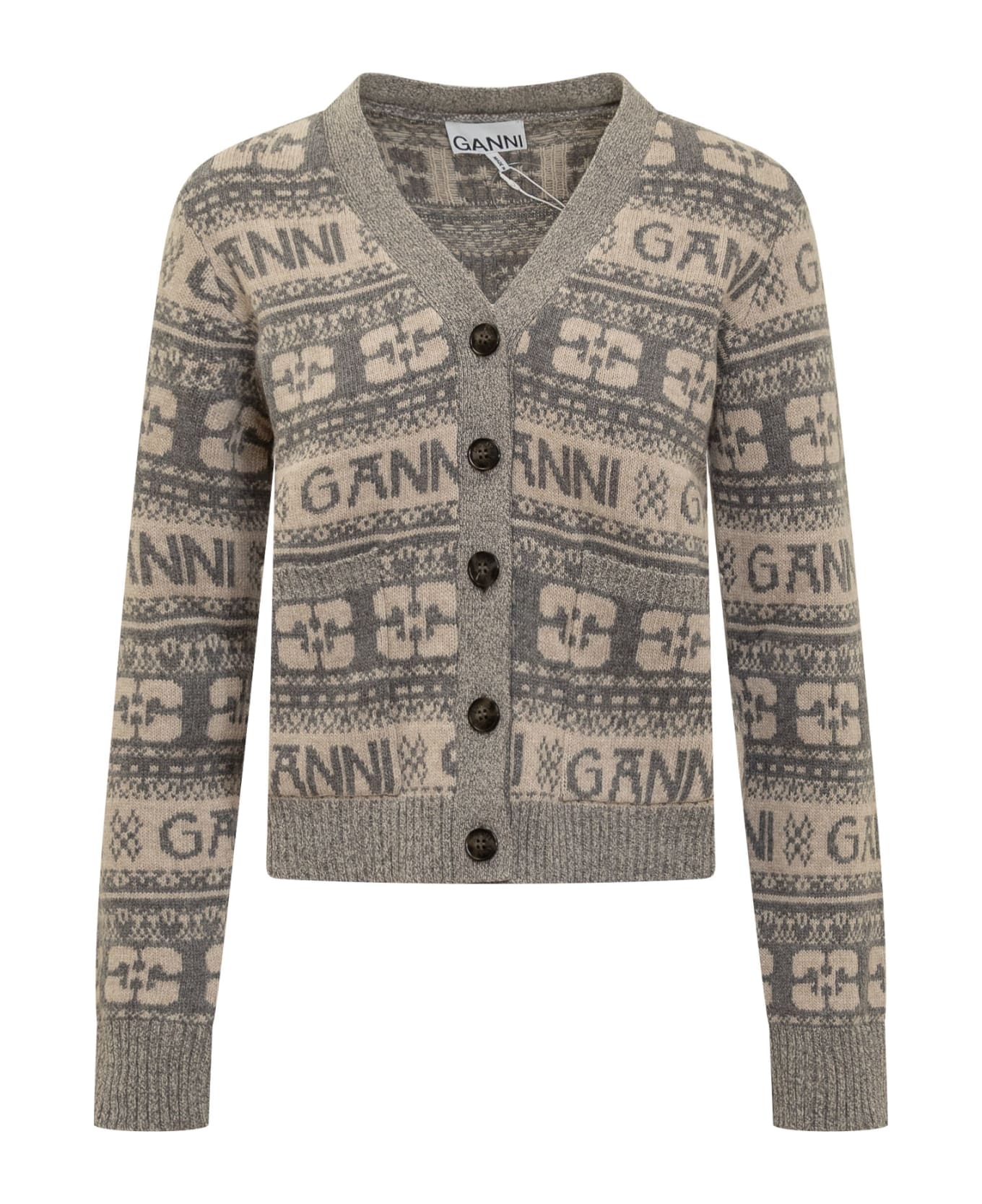 Long sleeve cardigan. V-neck. Front button closure. Ribbed edges. Front pockets. All-over logo. Composition: 45% Wool, 35% Recycled Wool , 20% Recycled Polyamide