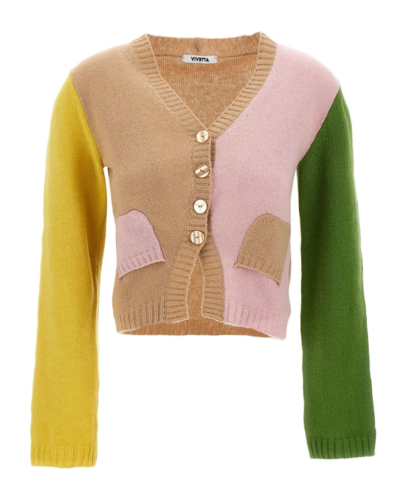 Vivetta women's cardigan, multicolor in shades of sand, green, pink and yellow, fastening with large mother-of-pearl effect buttons, two front pockets with reverse opening, ideal for autumn and winter. Made in Italy.