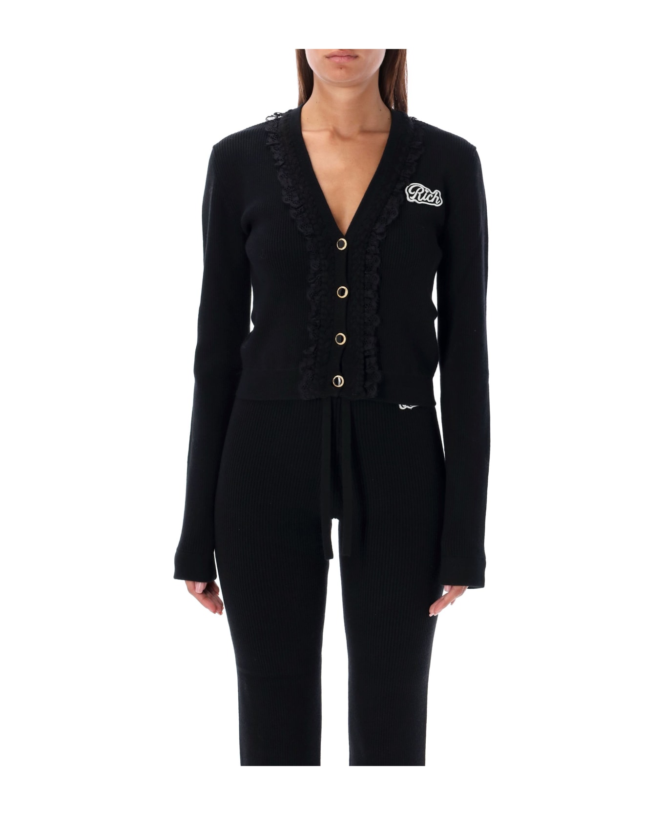 Wool Blend Knitted Cardigan By Alessandra Rich. Featuring: V-neck Long Sleeves Button Closure At Front Logo Patch At Chest Lace Details At Front Ribbed Cuffs And Hem Knitted Trim Slim Fit Model Is 1,72 M Tall And She Is Wearing Size 40