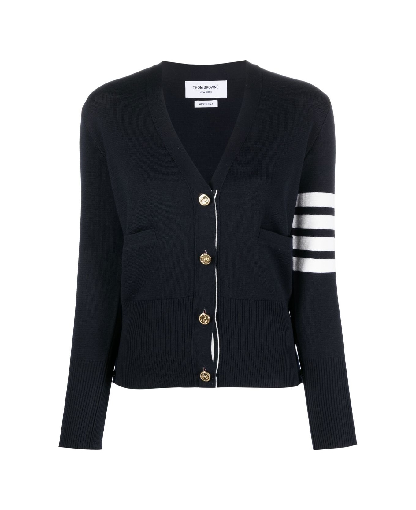Navy/red/white merino wool 4-Bar Milano stitch cardigan from THOM BROWNE featuring V-neck, front button fastening, long sleeves, ribbed cuffs, ribbed hem, Milano stitching, signature 4-Bar stripes, signature tricolour grosgrain trim and signature tricolour tab to the back.