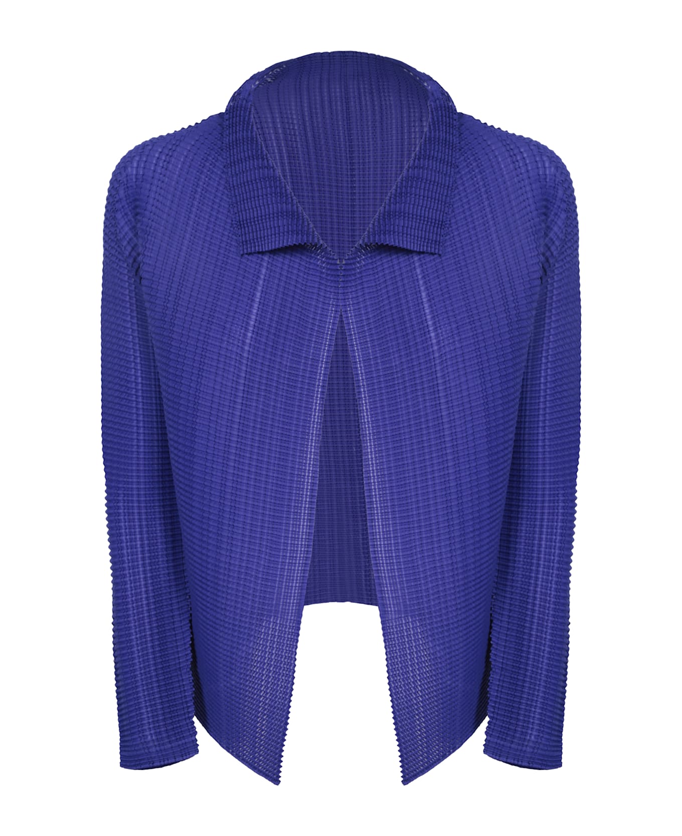 Elegant ISSEY MIYAKE cardigan in exclusive blue pleated fabric that enhances the silhouette with an open design and a refined classic collar.