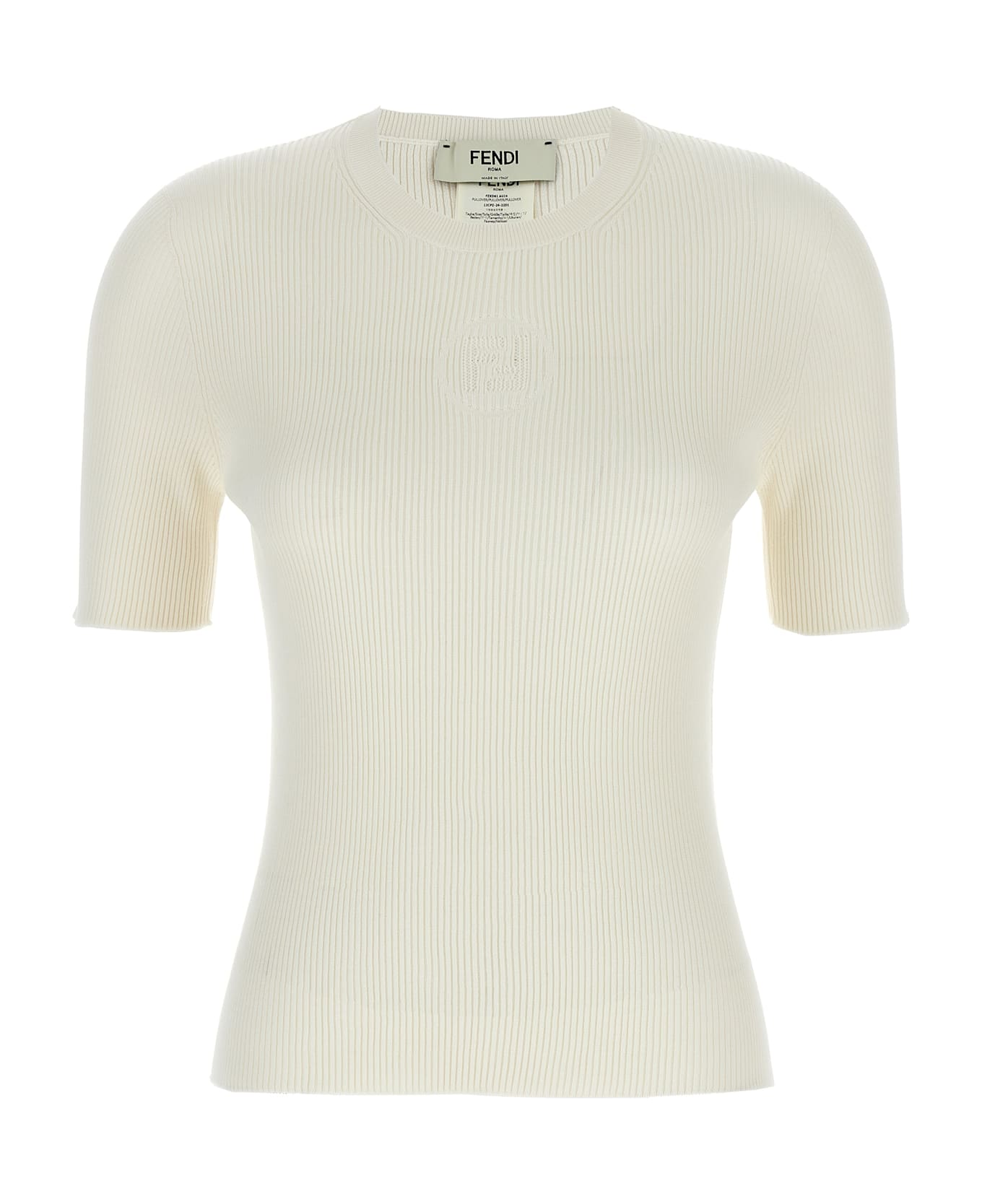 Ribbed stretch cotton and silk vanisé yarn sweater, front 'Fendi Stamp 1925' logo with dévoré pattern, crew neck, and short sleeves. Composition: 100% cotton