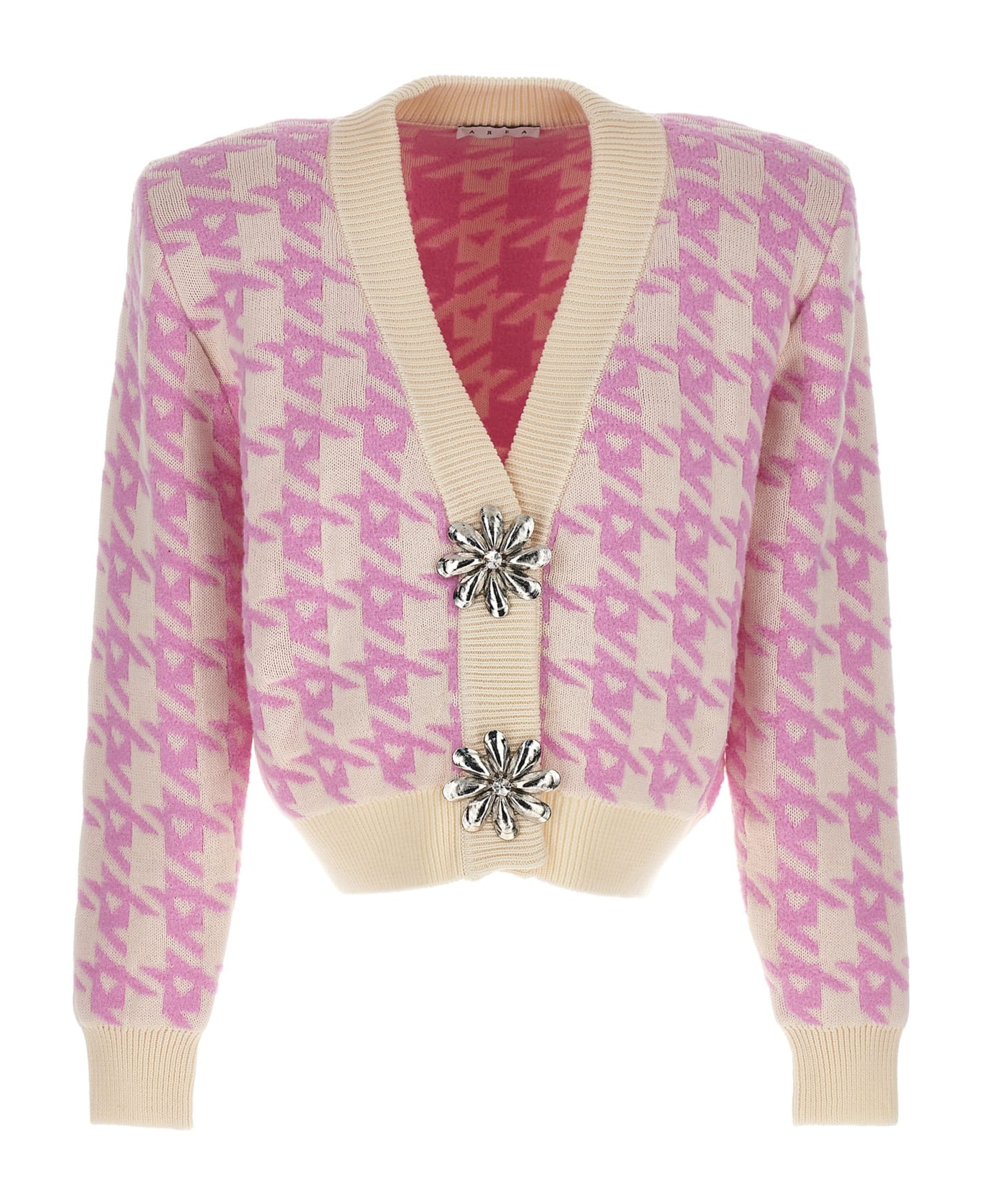 Cardigan crafted in a wool blend with maxi hooped de poule pattern, button closure, 'Flower' maxi application in metal with crystal, long sleeves and padded shoulders.