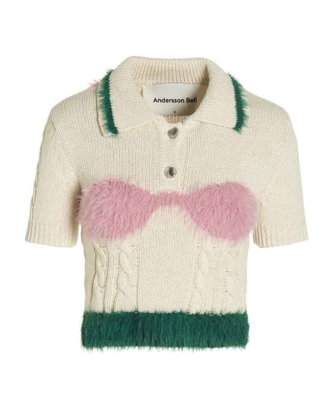 'Hayes Lingerie Intarsia' cotton sweater with contrast fur-effect details, collar, jewel button details, short sleeves. sleeves.