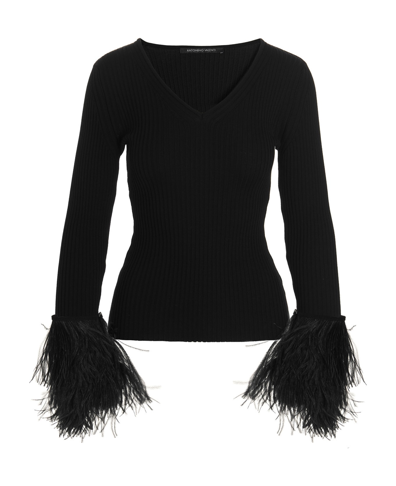'Jessica' ribbed merino wool sweater with a removable feather appliqué on the wrist and a V-neck.