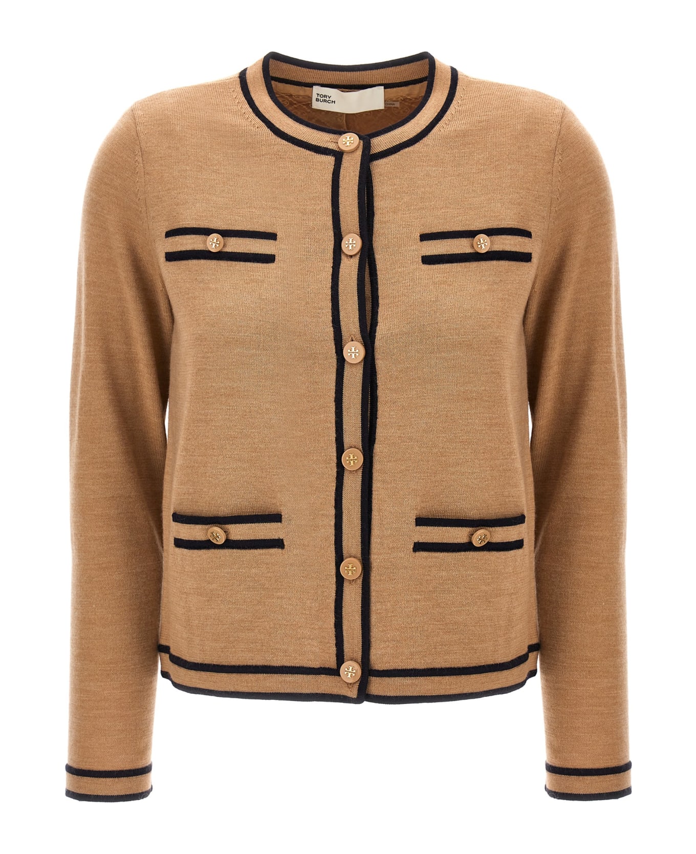 'Kendra' merino wool cardigan with contrast piping, logo metal button closure, crewneck model with all-over monogram logo lining.