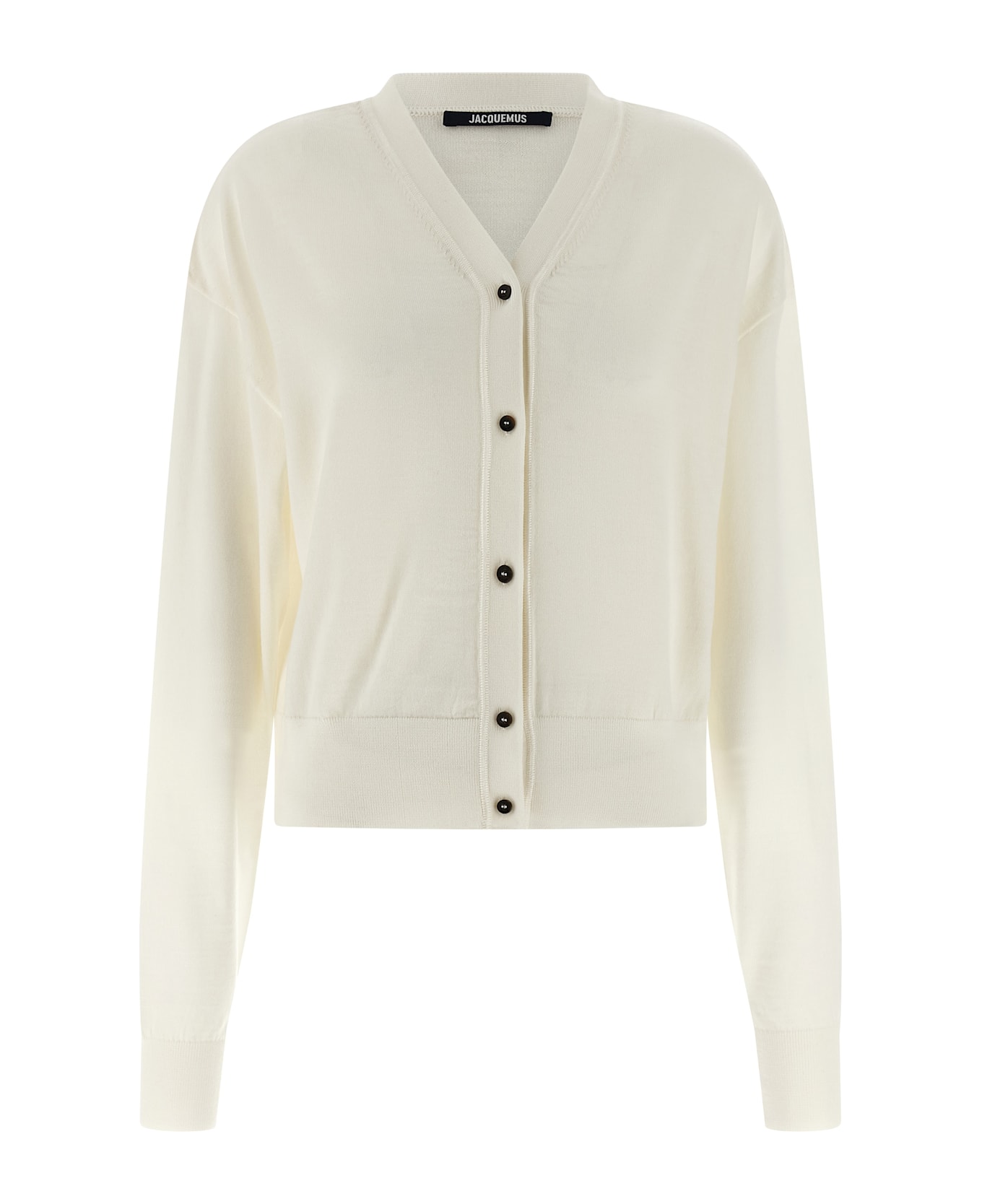 Le Cardigan Brodé' merino wool cardigan with tone-on-tone embroidered logo at the back, V-neck, front button closure, long sleeves with cuffs and dropped shoulders. Composition: 90% merino wool 6% polyamide