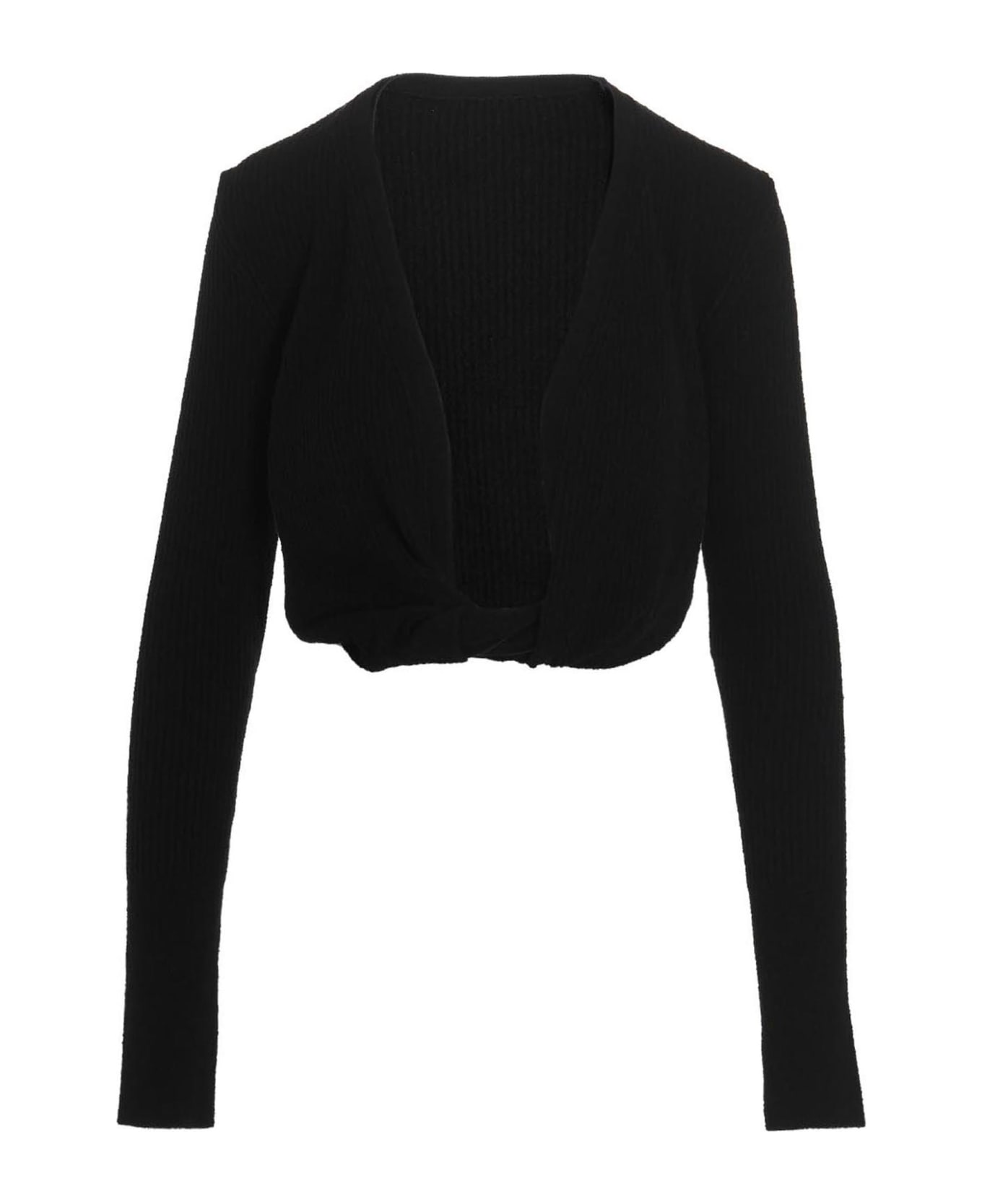 Le Gilet Noue' cotton blend cardigan with no closure, featuring a deep neckline and a knot detail on the bottom hem. Composition: 75% cotton 25% polyamide