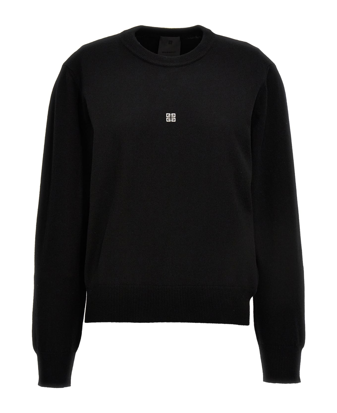 Wool and cashmere sweater with logo on the front and back, crewneck, and long cuffed sleeves.