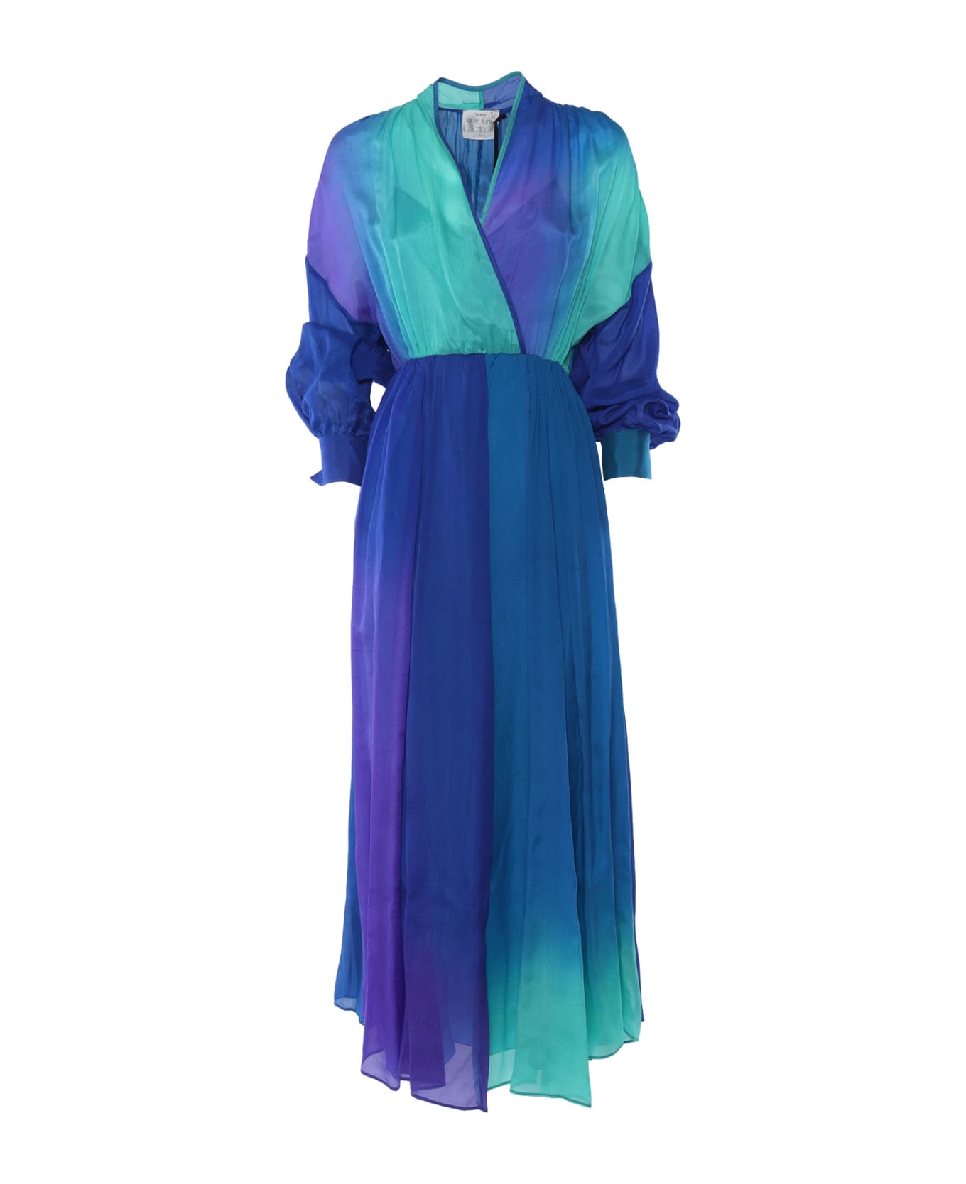 Forte Forte blue shaded silk crèpon long dress for women, long puff sleeves with cuffs, soft flared skirt, crossed neckline.