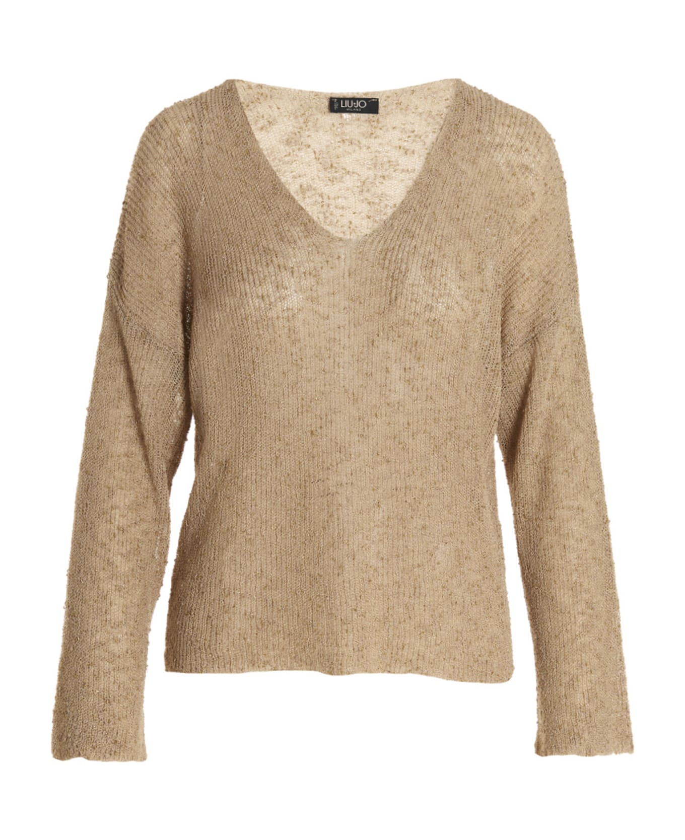 Viscose blend sweater with metal thread, V-neck and wide and long sleeves.