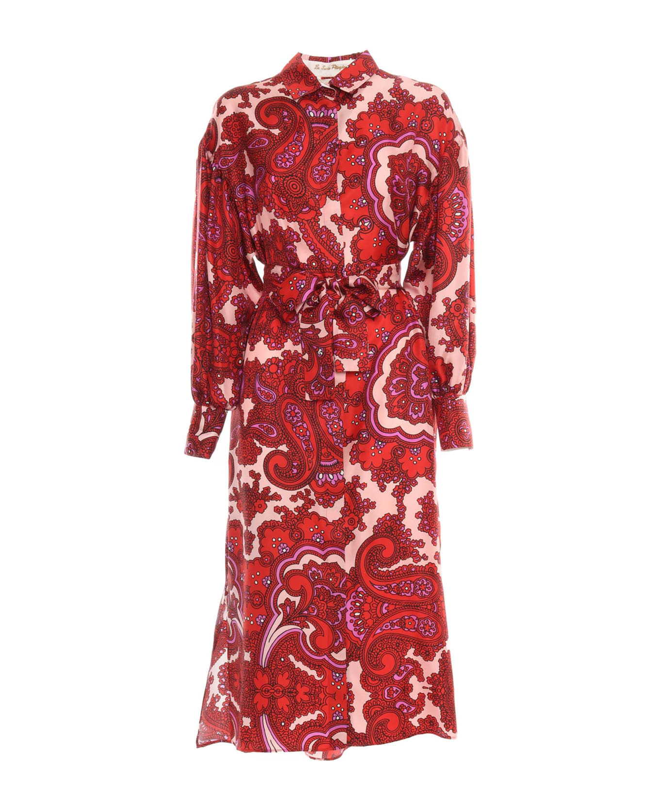 Silk pinafore dress, classic collar, buttoned cuffs, contrast paisley print, matching belt