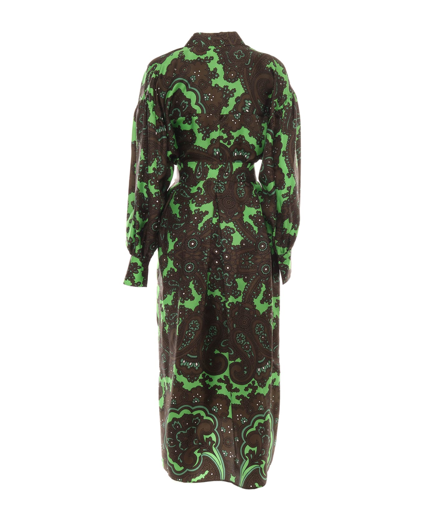Silk shirt dress, classic collar, buttoned cuffs, contrast paisley print, matching belt