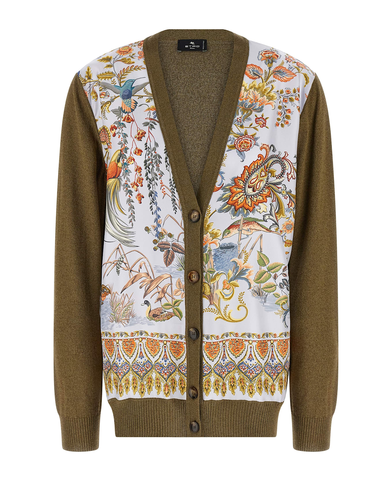 Cardigan in cotton blend and solid color viscose with silk insert Paisley foliage pattern on the front, V-neck, button closure, long cuffed sleeves, band on the hem. Composition: 60% cotton 40% viscose