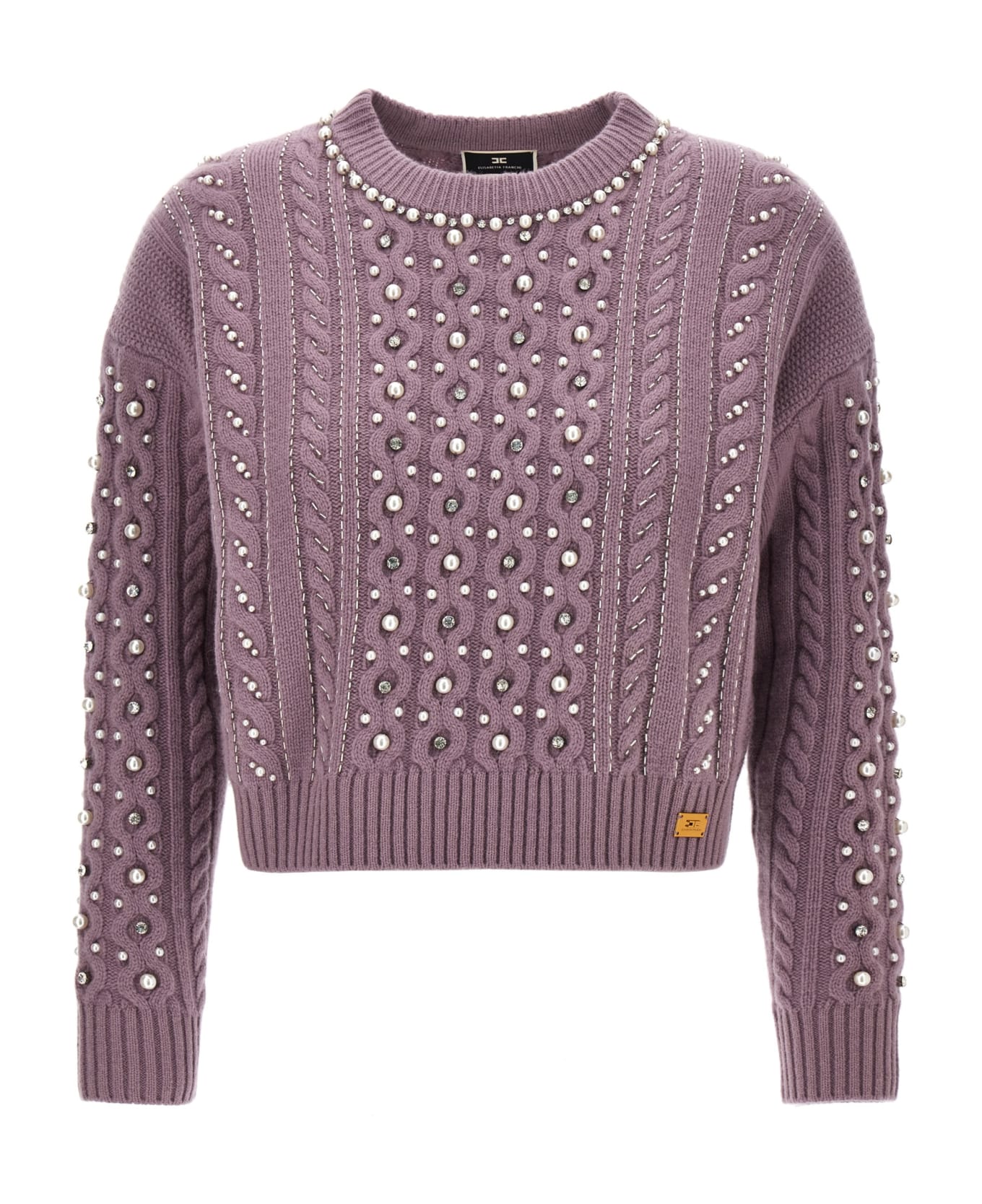 Wool sweater with braided pattern, crewneck embellished with embroidery with pearls and crystals.