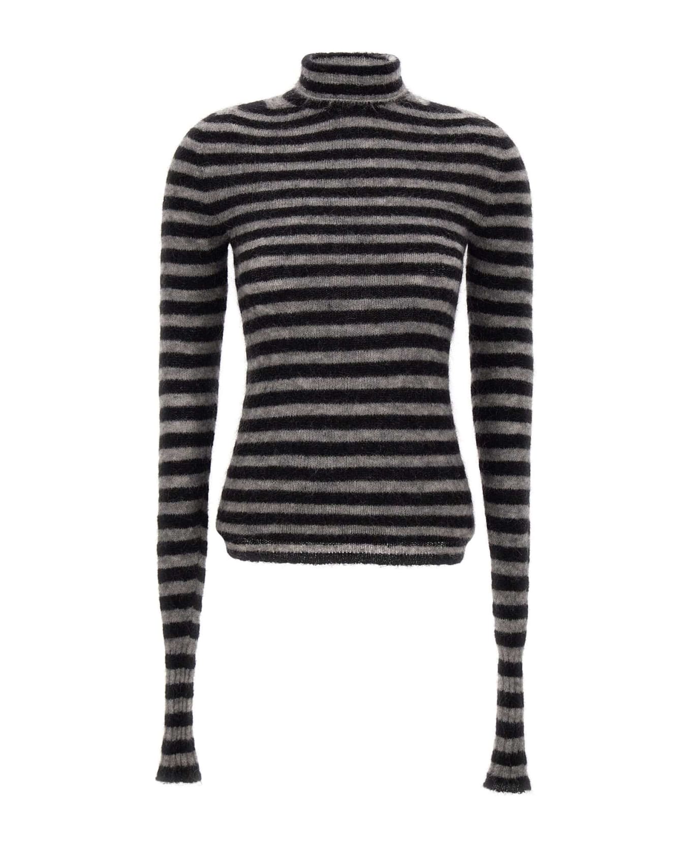 Philosophy di Lorenzo Serafini women's sweater in wool and cashmere, gray and black horizontal striped pattern, high collar, very long sleeves, ideal for autumn and winter season. Made in Italy.