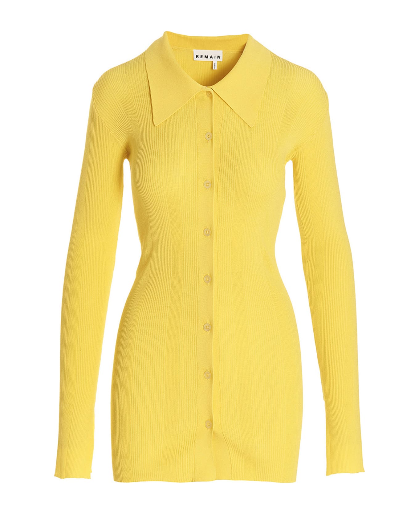 Ribbed viscose knit cardigan with polo-style collar and a button closure.