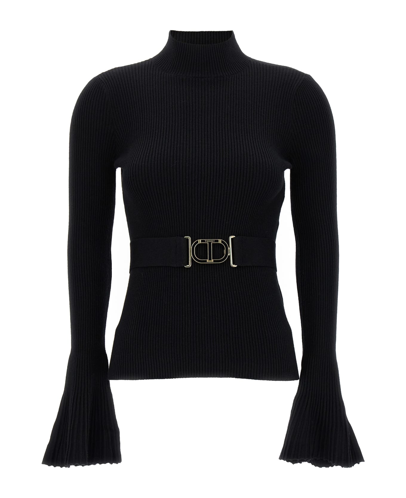 Ribbed fabric sweater with high neck, long flared sleeves and a belt at the waist with logo buckle.