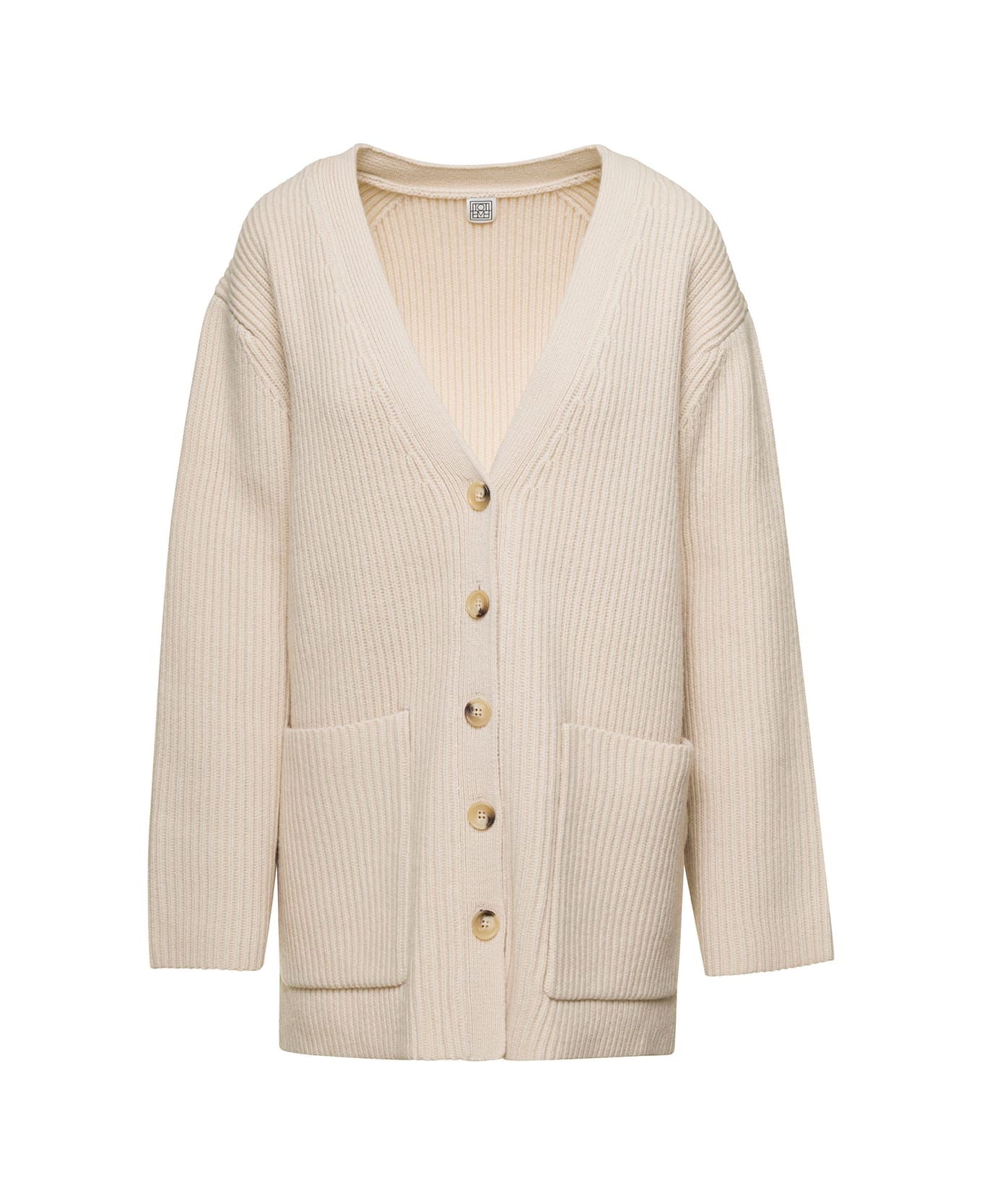 Cardigan Ribbed knit Long sleeves Front button fastening Two front patch pockets Drop shoulders White Wool Oversized fit