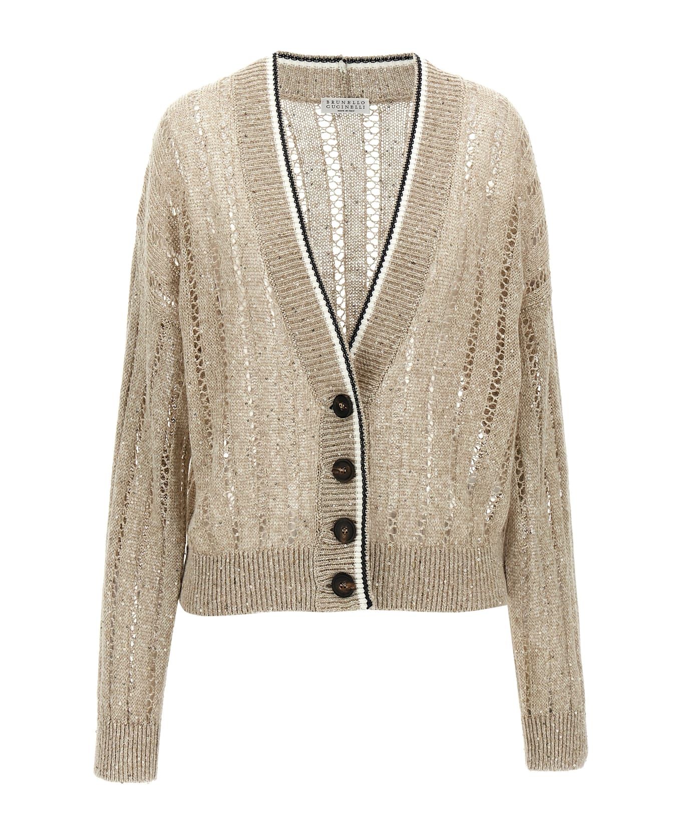 Rustic Dazzling Net' linen blend cardigan with mesh processing and all-over sequin appliqué, V-neck, front button closure, long cuffed sleeves and dropped shoulders. Composition: 94% linen 6% nylon
