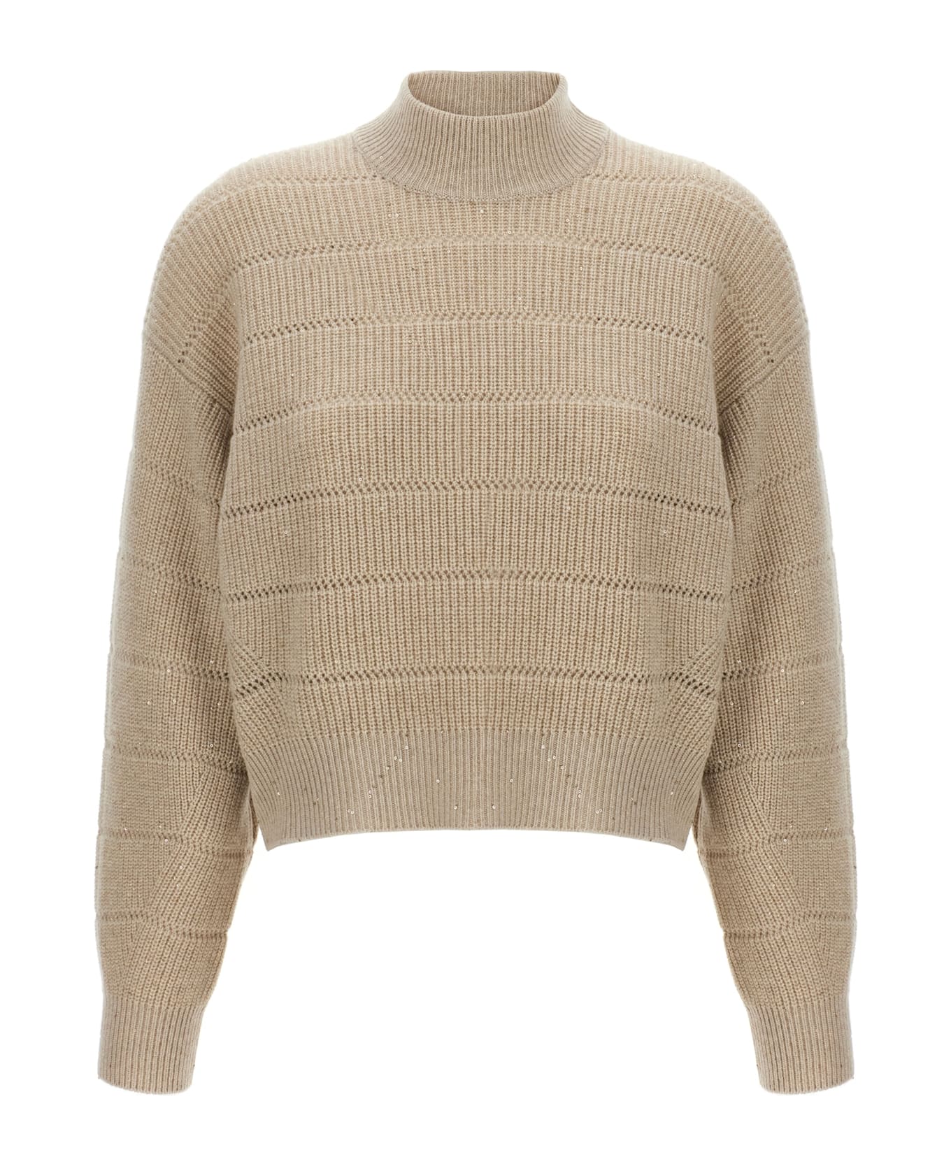 Rustic Dazzling Net' crochet wool sweater with all-over sequin appliqué, crop style, high neck, long sleeves with cuffs and dropped shoulder. Composition: 47% ws 47% wo, 4% pl, 2% pa