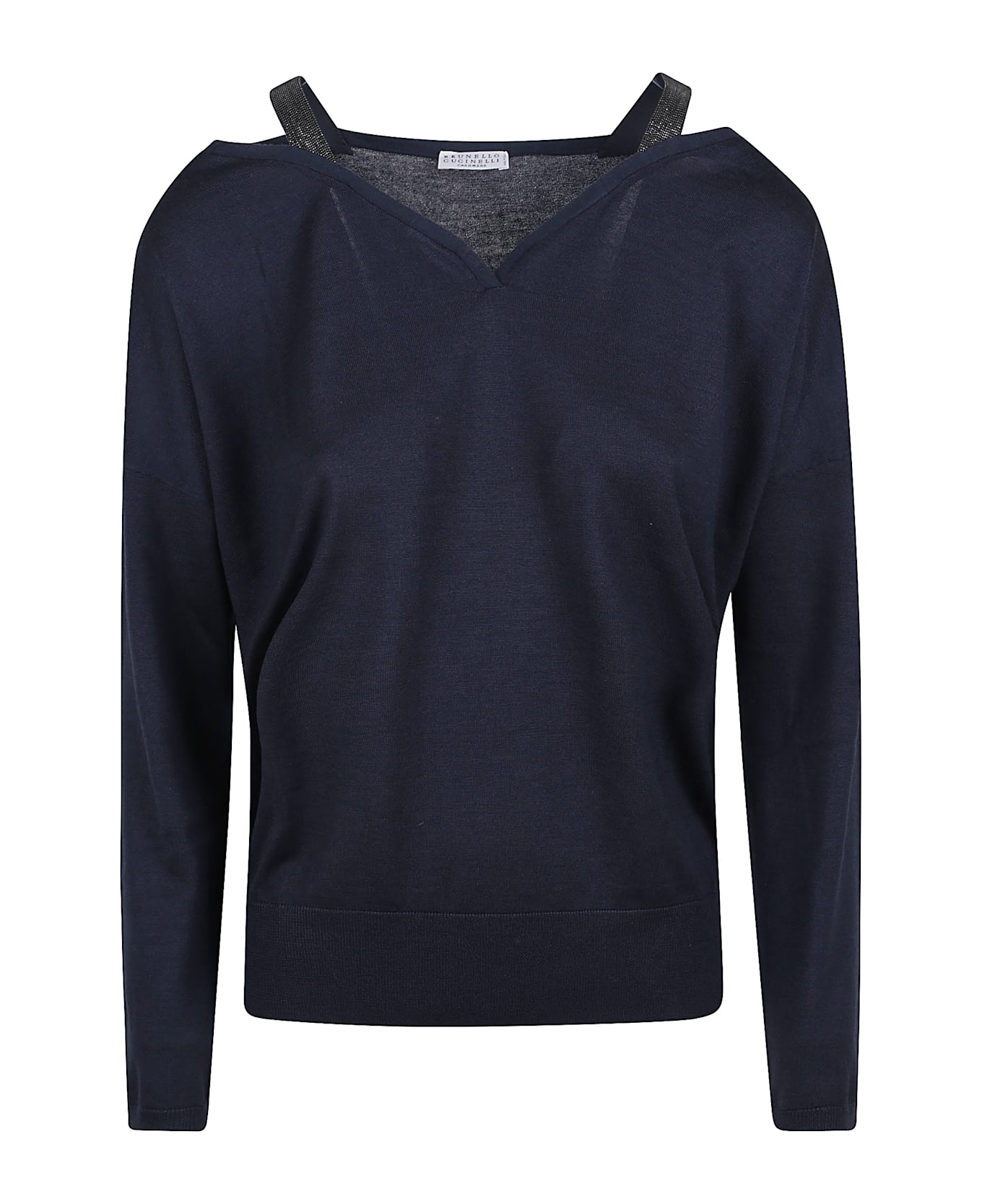 Silk blend cashmere top by BRUNELLO CUCINELLI. V-neck; dropped shoulder; profiles with ribbed elastic. Featuring shoulder straps embellished with jewellery.
