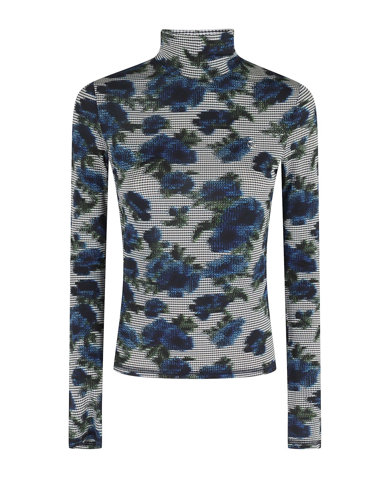 . Top - Blanket - Blue color - High neck - Jersey fabric - Abstract floral print resembles a pixelated memory - Long sleeves .