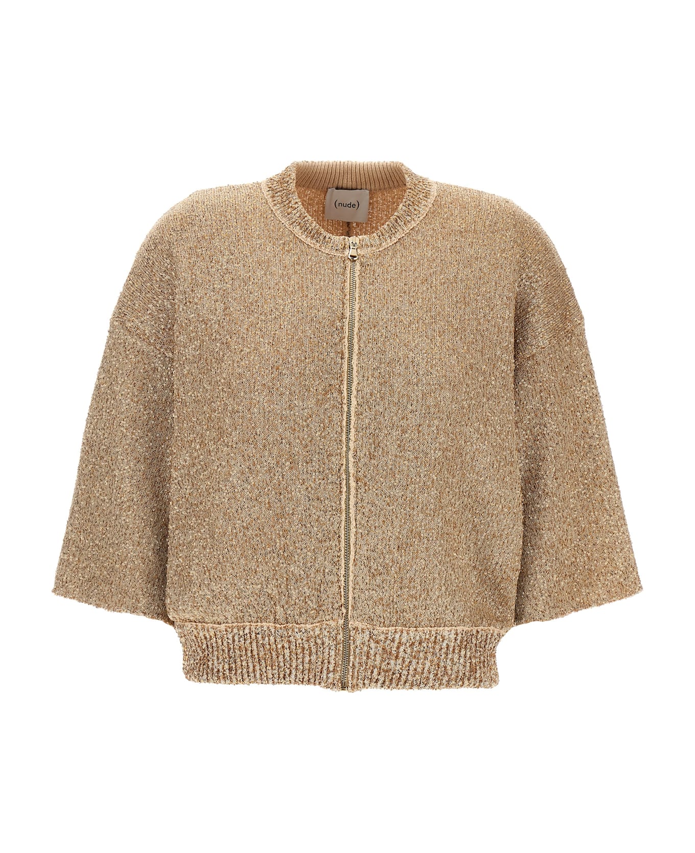 Sequin knit cardigan, crew neck, front zip closure, short sleeves.