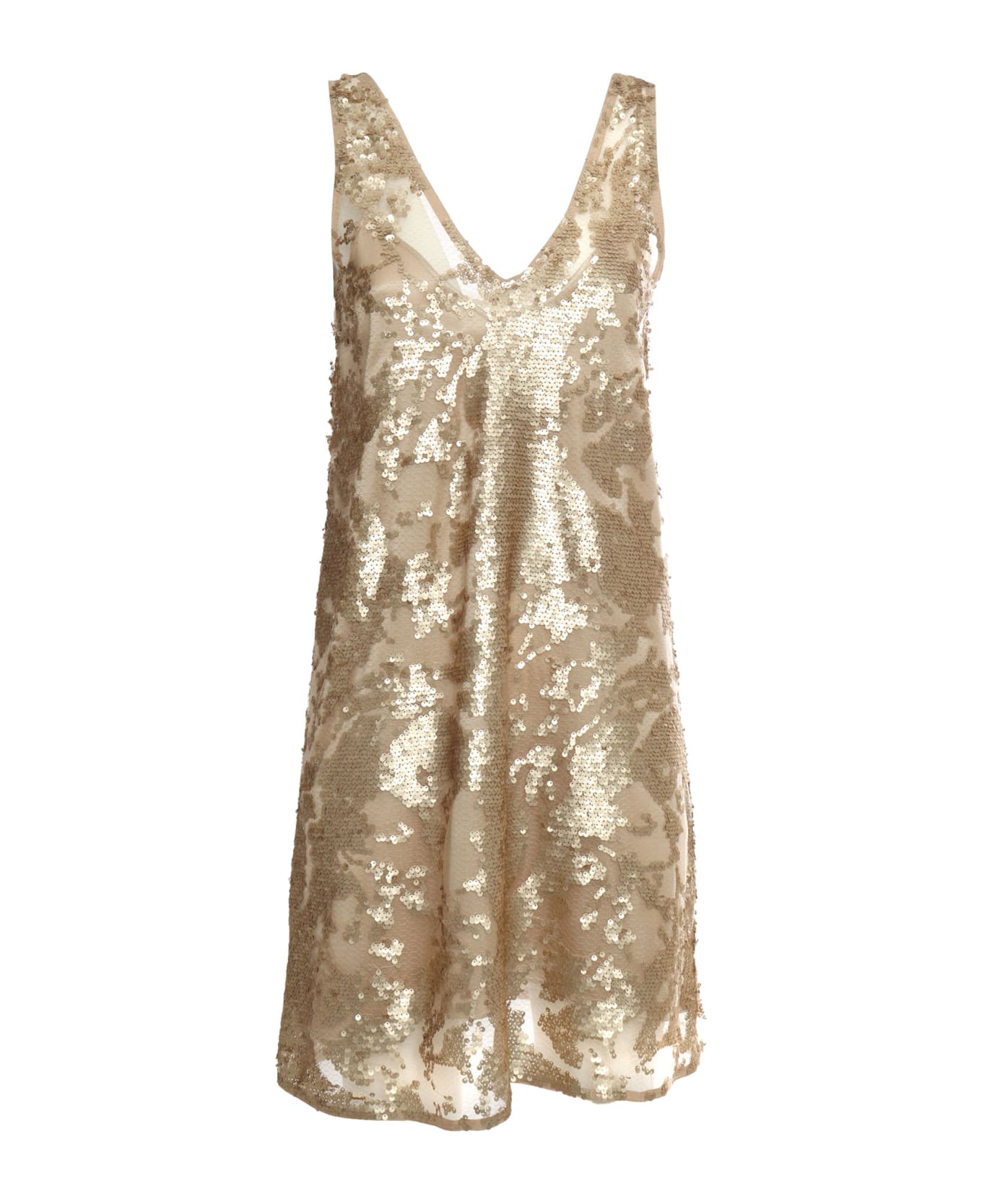 Semi-transparent dress, gold sequin application, V-neck, sleeveless