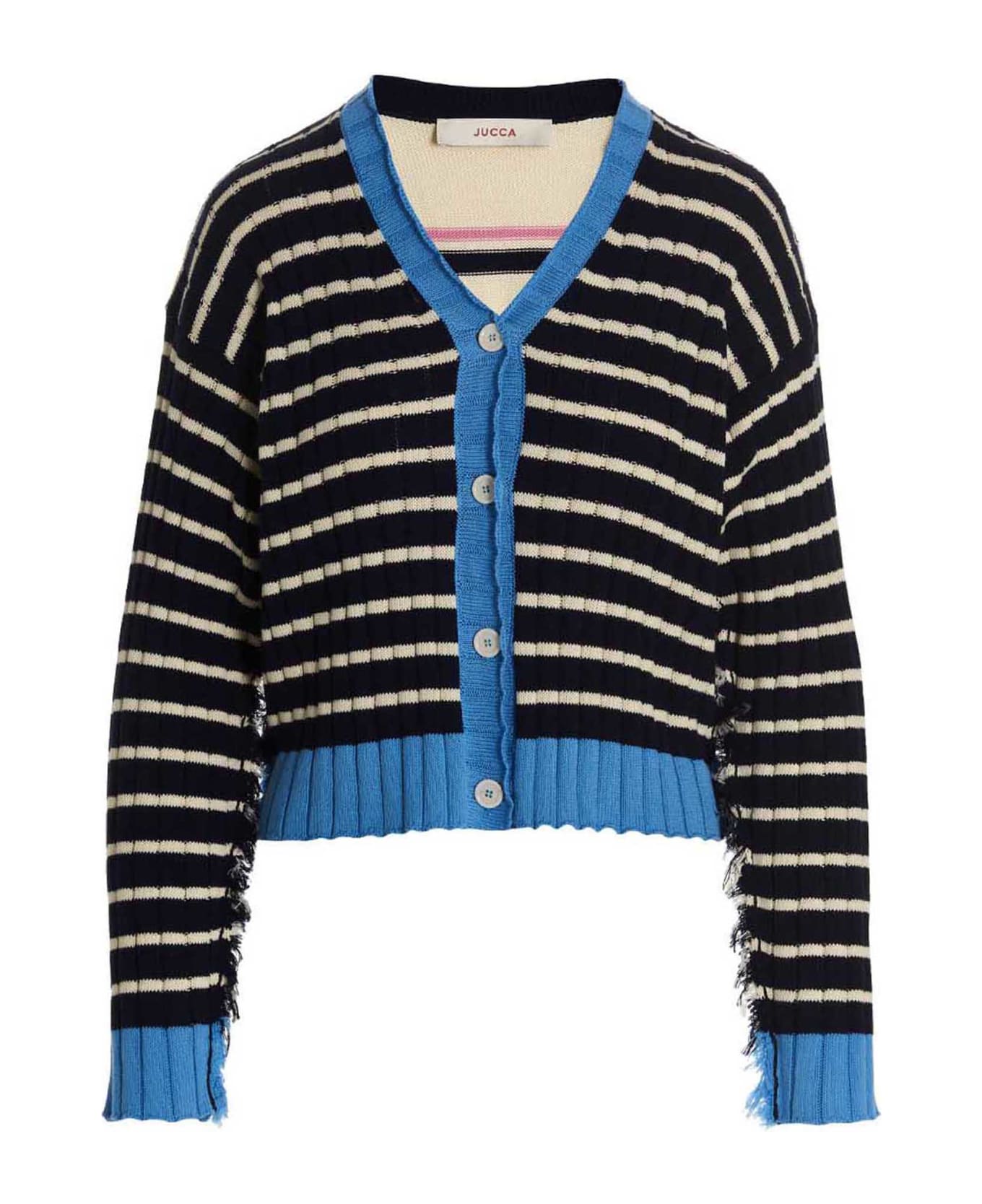 Horizontal striped cardigan with contrast edging, frayed edging, button closure and a V-neck.