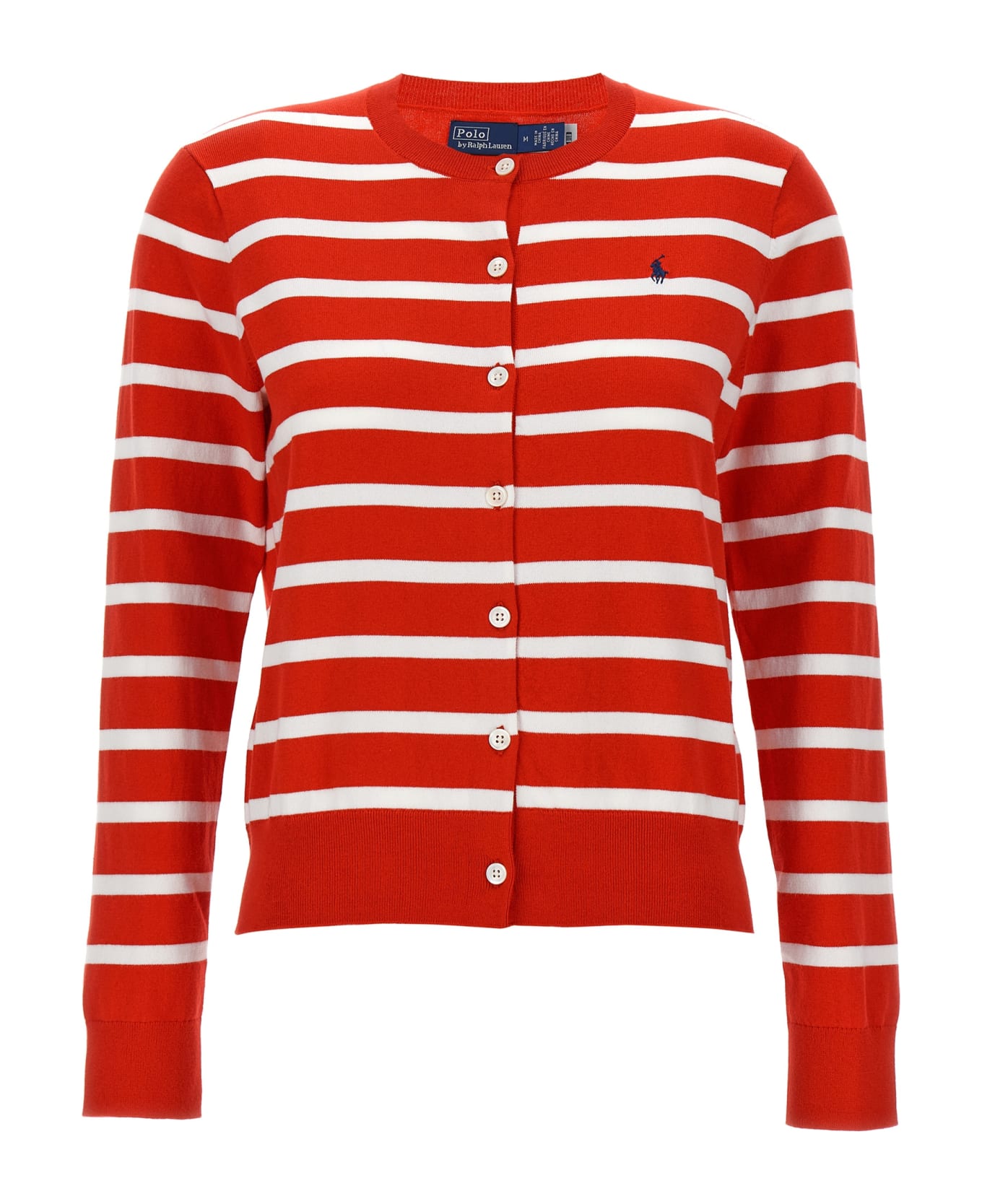 Cotton knit cardigan with striped pattern, button closure, crew neck, logo embroidery on the chest.