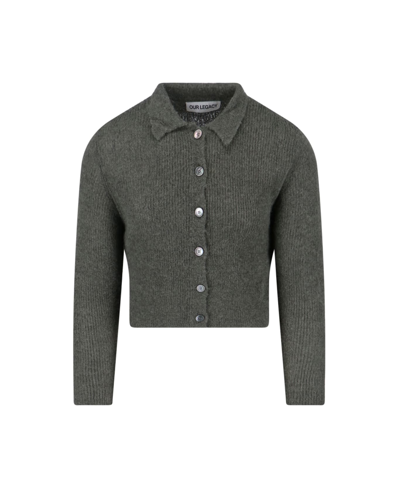 Cardigan "Mazzy" Our Legacy cropped knit, green alpaca blend with ribbed knit, classic collar, button closure, straight hem.