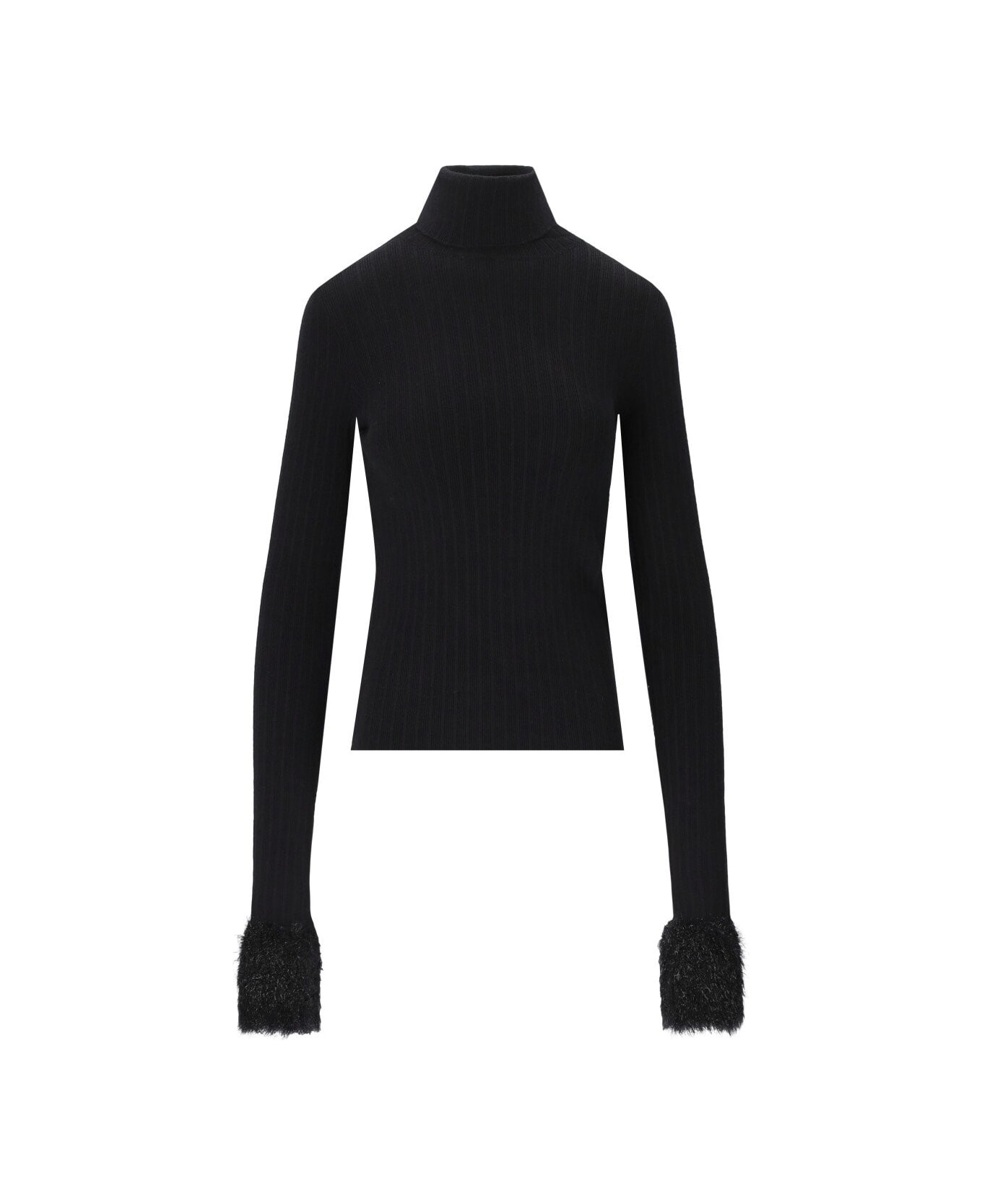 Blugirl turtleneck jumper made of ribbed black viscose blend, embellished with synthetic fur and lurex cuffs. Tight fit. Composition: 52% viscose, 28% polyester, 20% polyamide.