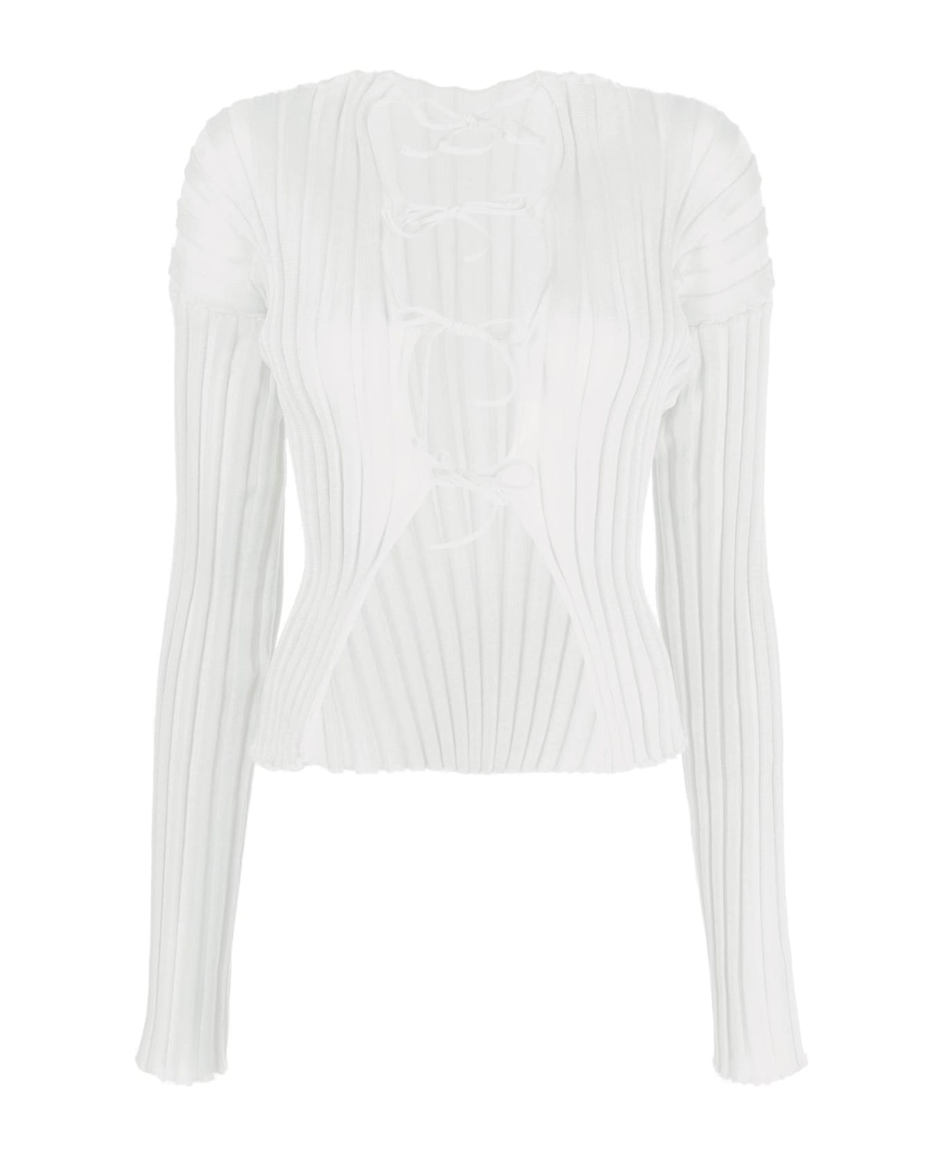 Katrine fitted cardigan by A. ROEGE HOVE crafted in semi-sheer ribbed technical cotton knit, featuring front tie closure, long sleeves and crew neckline. The model is 177 cm tall and wears a size M/L.