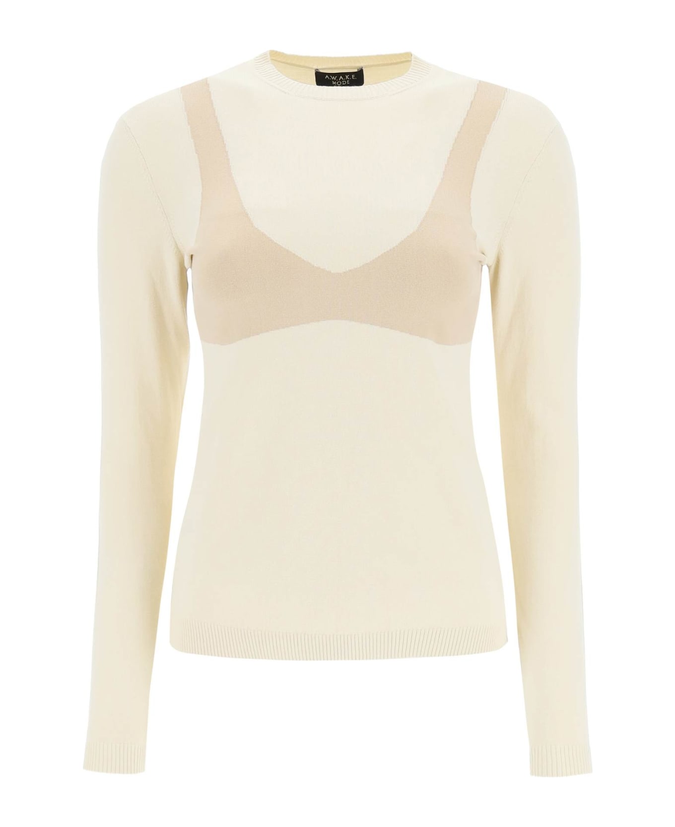 Crew neck top in viscose blend knit by A. W. A. K. E. Mode, embellished with a contrast bralette-like intarsia at front and back. Ribbed edges, regular fit. The model is 177 cm tall and wears a size XS.