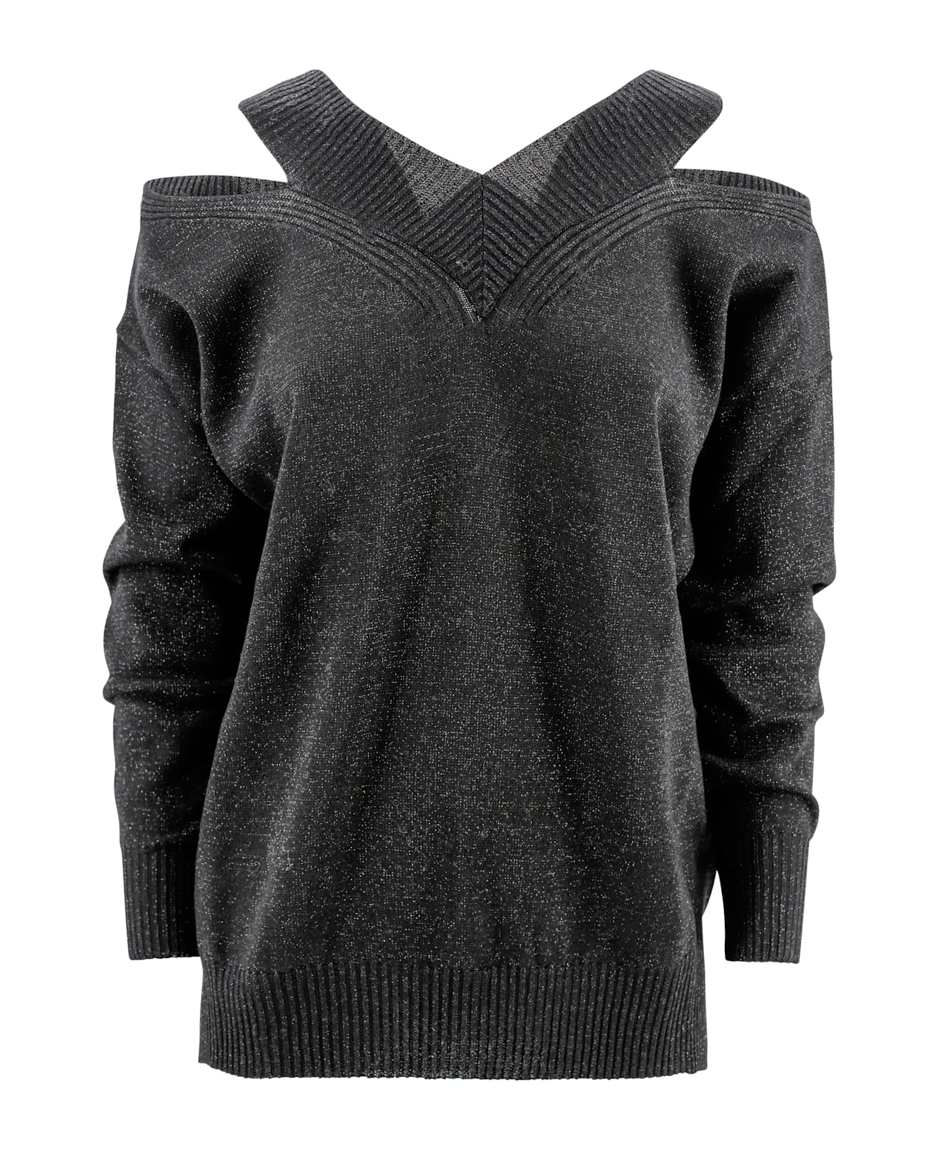 wool blend, knitted design, lurex detail, ribbed V-neck, cut-out detail, long sleeves, ribbed hem and cuffs, straight hem. Composition: 61% Wool, 27% Viscose, 12% Polyester