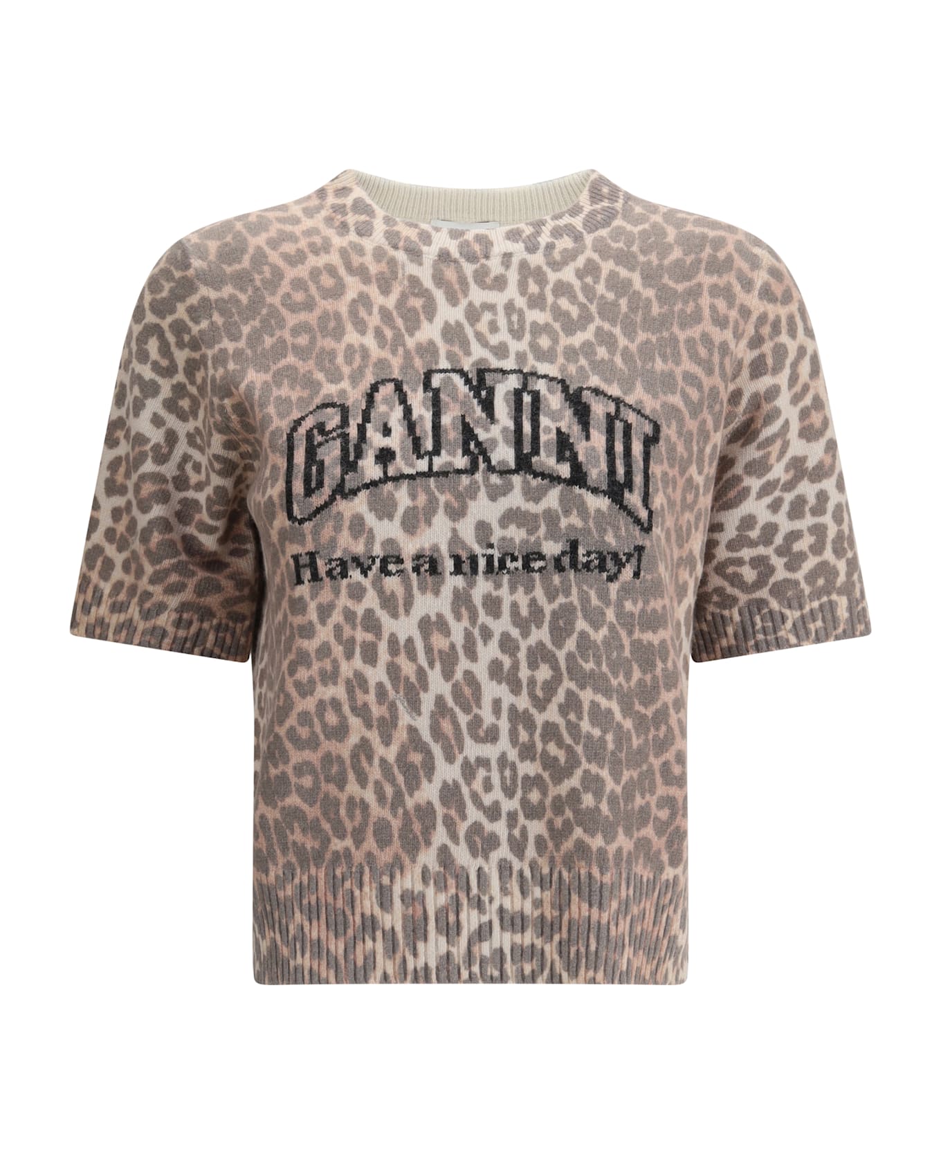 Ganni's leopard print short sleeve sweater combines grit and irony in a unique design. featuring a crew neck and ribbed hems, it is distinguished by an animal print and the brand's iconic signature on the front, accompanied by the words "have a nice day. " a bold garment, perfect for expressing style with lightness.