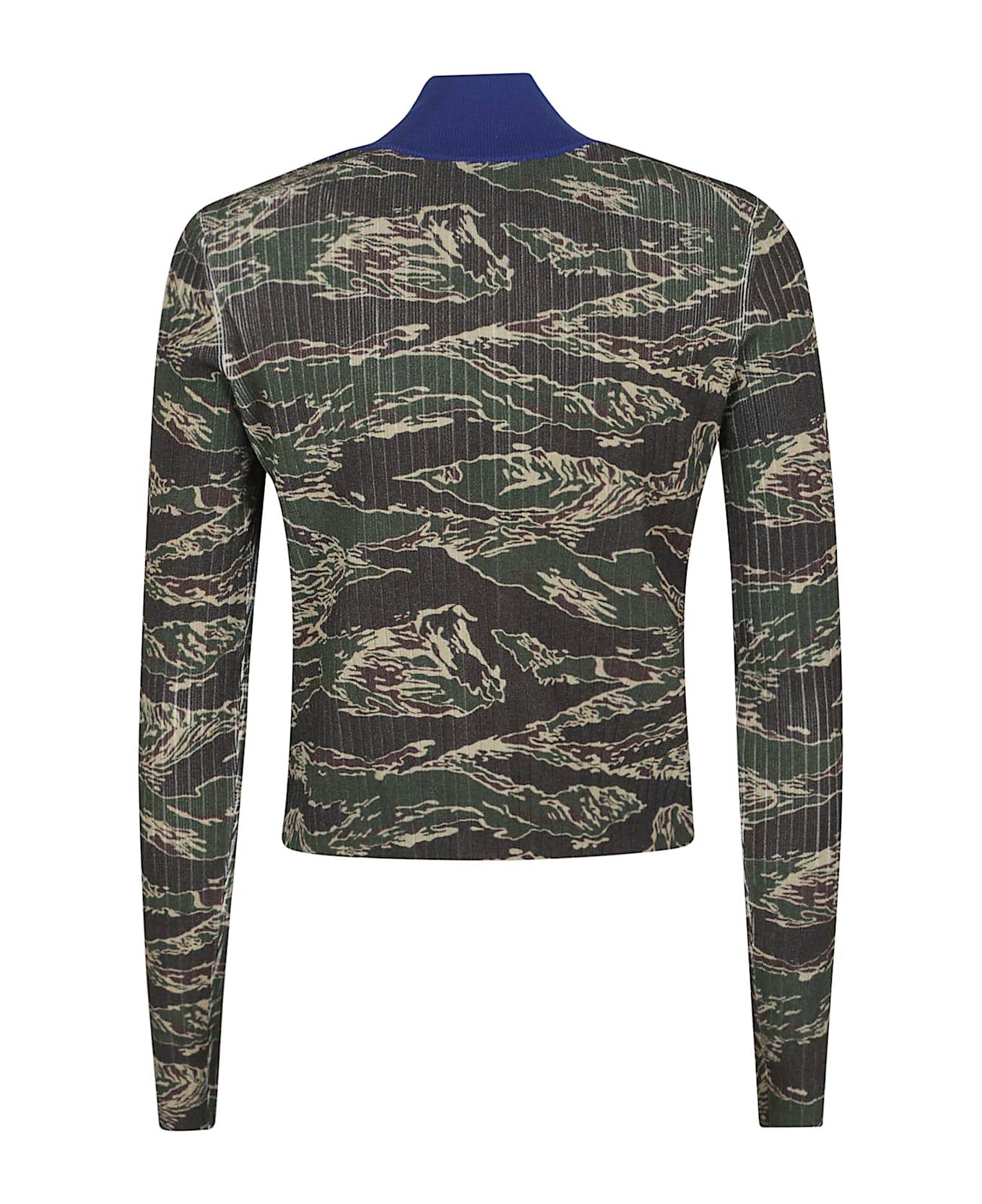 Sweater made of viscose jersey with a percentage of sustainable fibers by DIESEL. High neck; double-slider zip closure; slim-fit design with a ribbed knit. Featuring a reinterpreted khaki camouflage pattern with a contrasting colorblock insert and a D patch adorning the chest.