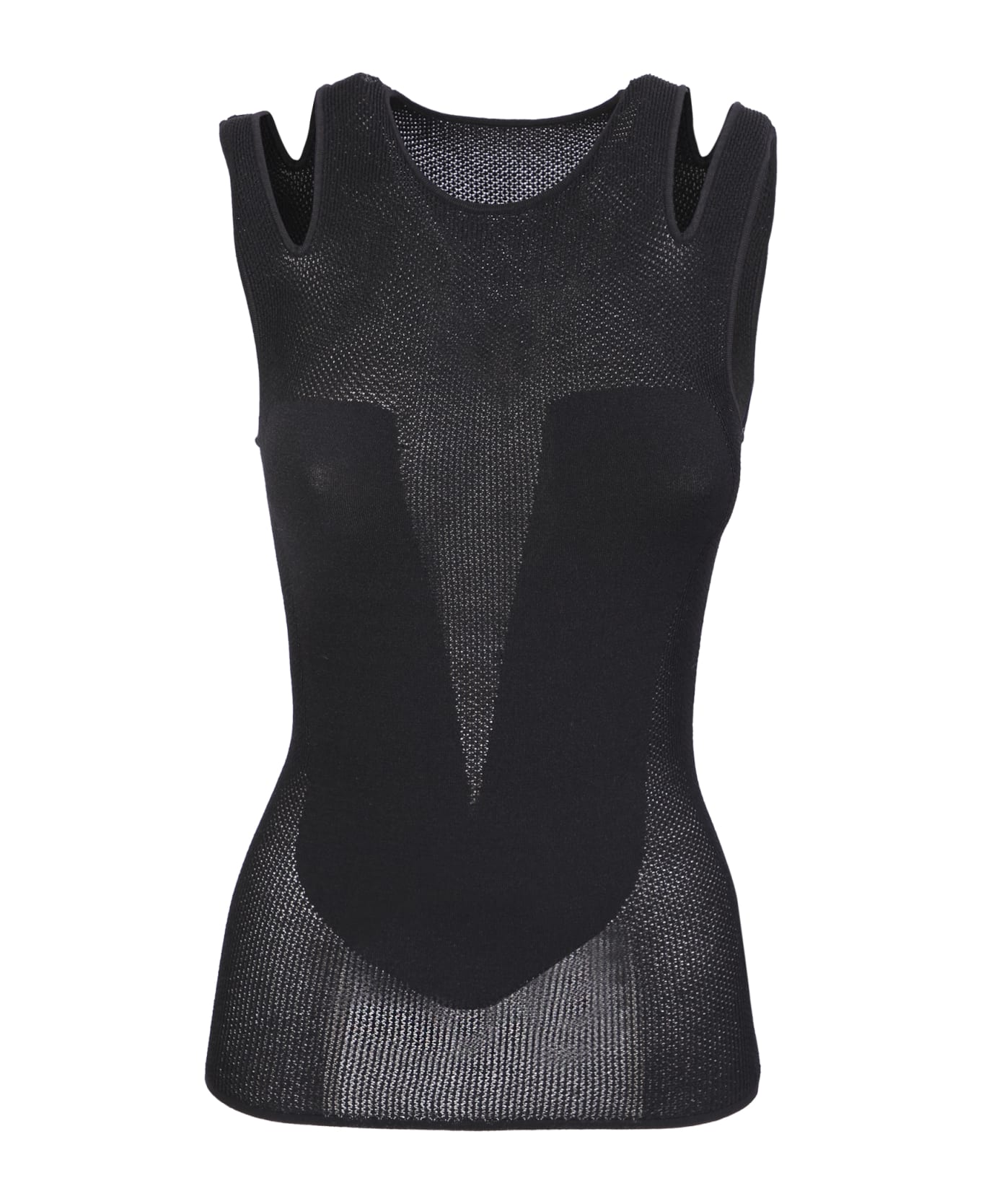 Roundneck. Sleeveless. Cut out detailing. Mesh detailing. Color: black