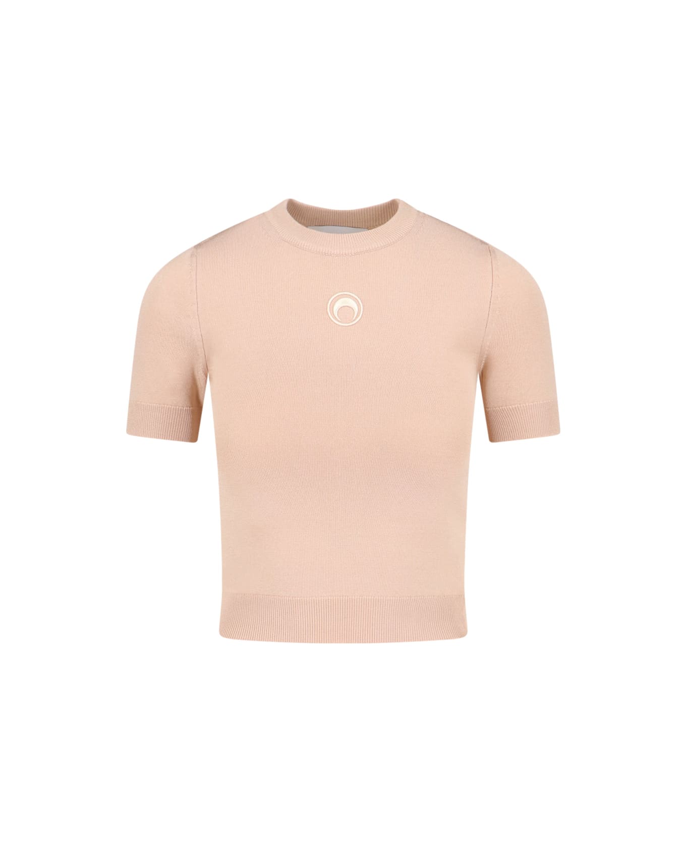 Marine Serre 'Moon' logo sweater in pink fabric with knit, crew neck, ribbed trims, short sleeves, white logo embroidery on the front, straight hem. Composition: 88% Viscose, 12% Polyester