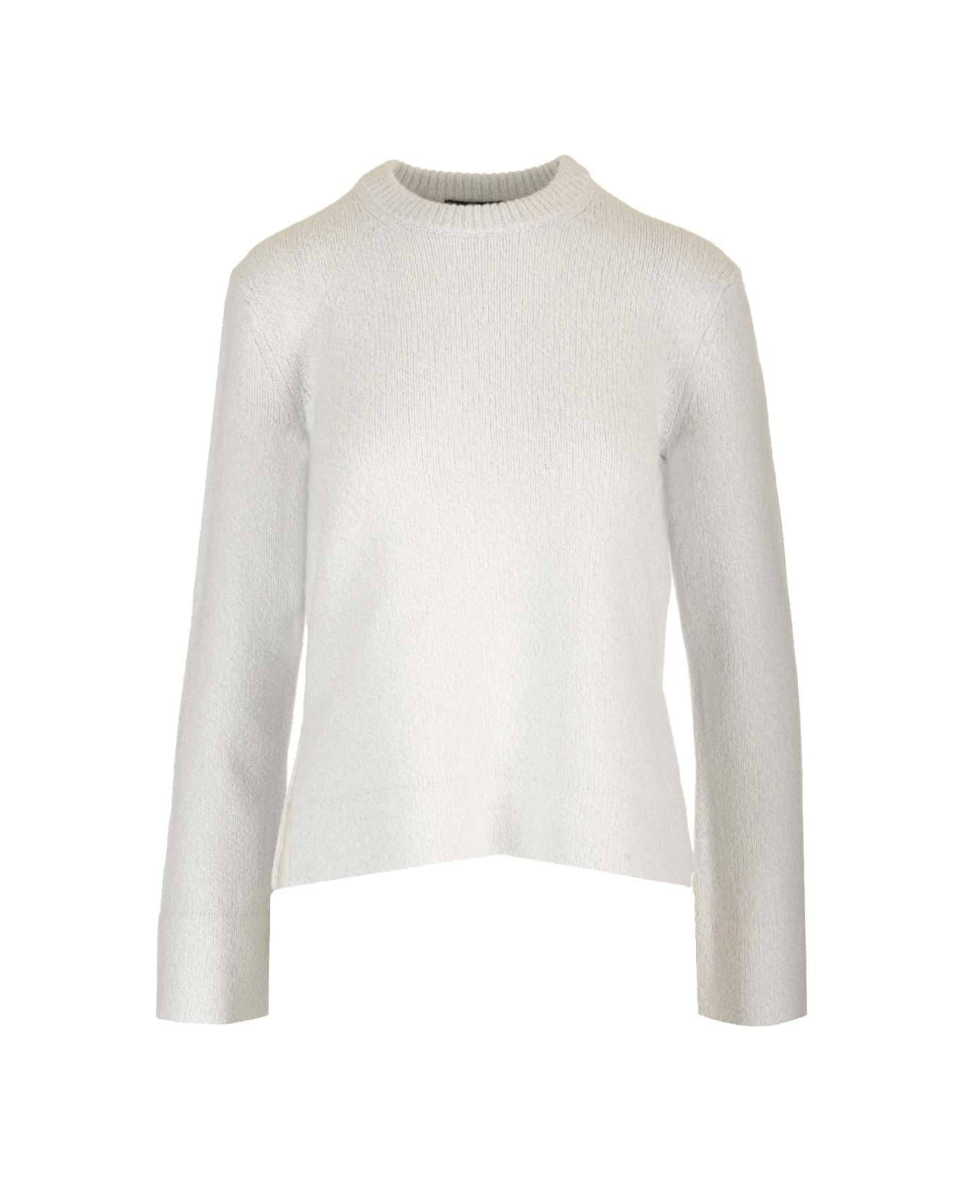 Pale blue moulin nit wool, cotton and cashmere crew-neck sweater from Theory, with long sleeves, asymmetric side slits and standard fit.