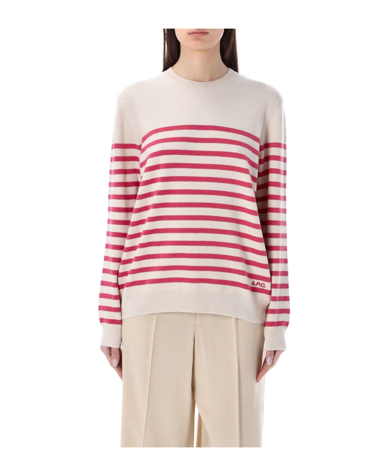 Cashmere And Cotton Blend Phoebe Jumper By A. p. c.. Featuring: Ribbed Crew Neck Long Sleeves Stripes Pattern A. p. c. Embroidery At Frontal Hem Straight Cut Rib Trims The Model Is 1,72m Tall And She's Wearing Size S