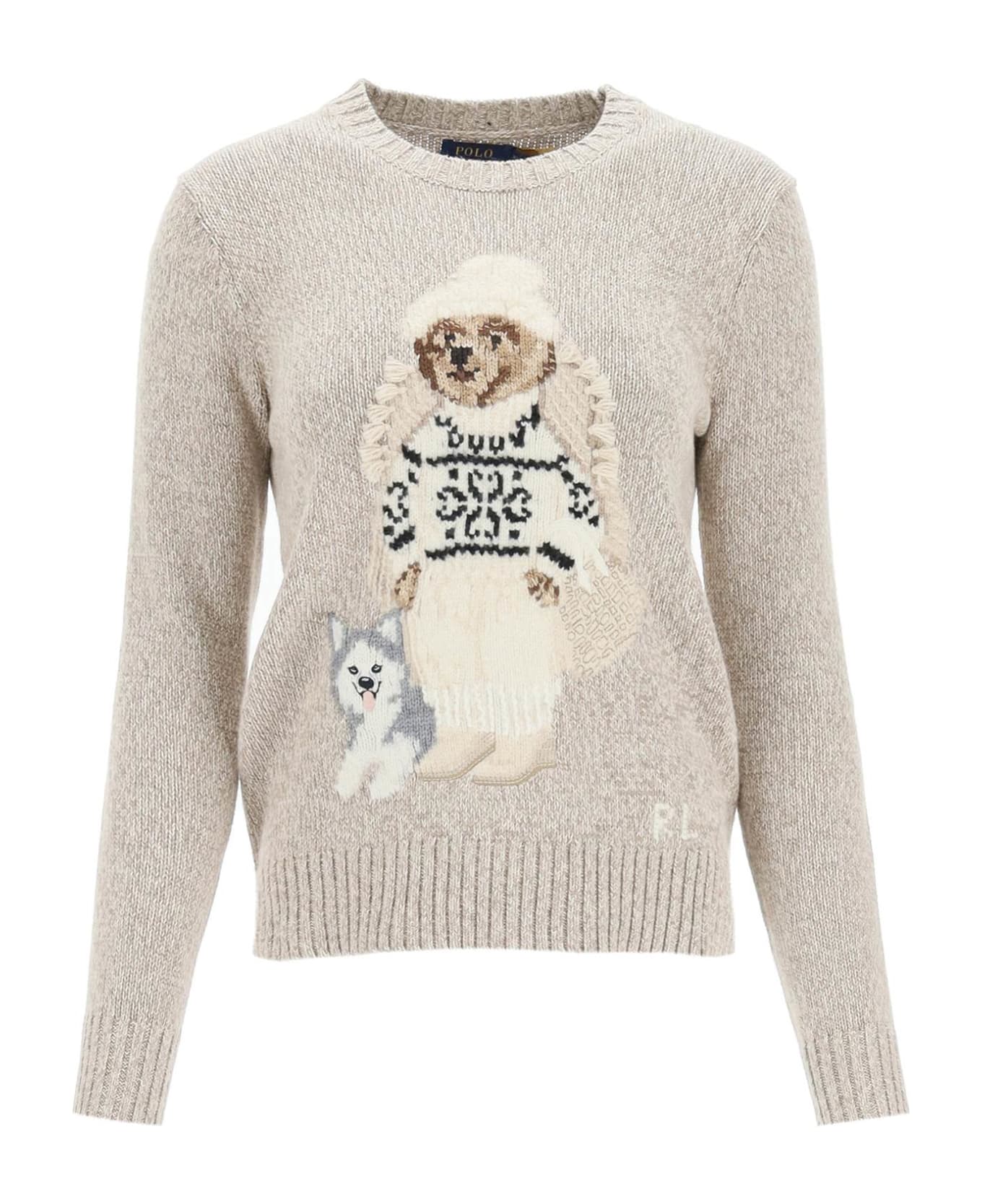 Crew-neck neck sweater by Ralph Lauren in mélange cotton yarns, decorated by a Polo Bear with husky intarsia at front, and R. L. initials embroidered at the bottom. FInished with ribbed edges. Regular fit. The model is 177 cm tall and wears a size XS.