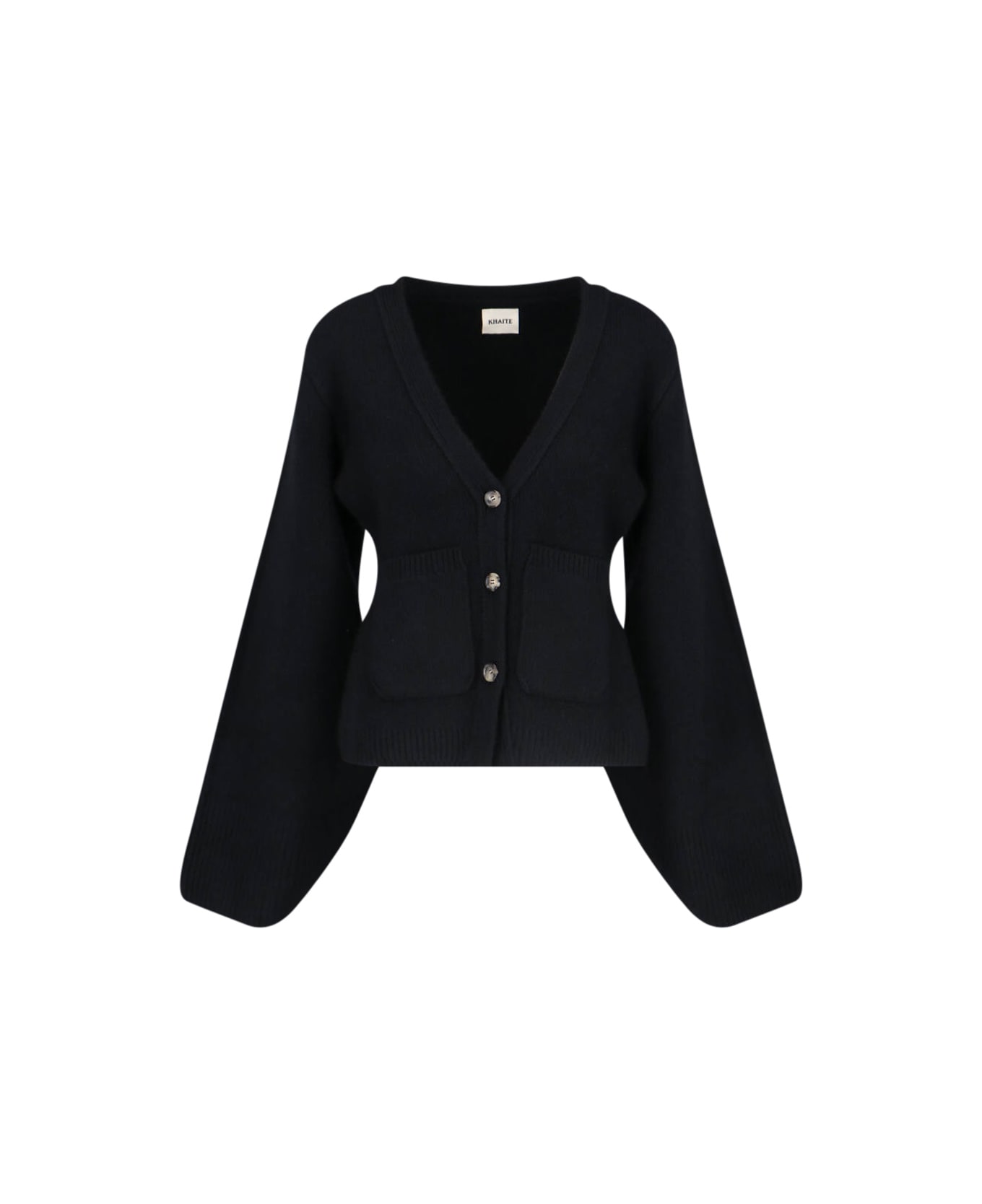 Khaite 'Scarlet' black cashmere cardigan with V-neck, wide sleeves, button closure, ribbed trim, two front patch pockets, straight hem. Composition: 100% Cashmere