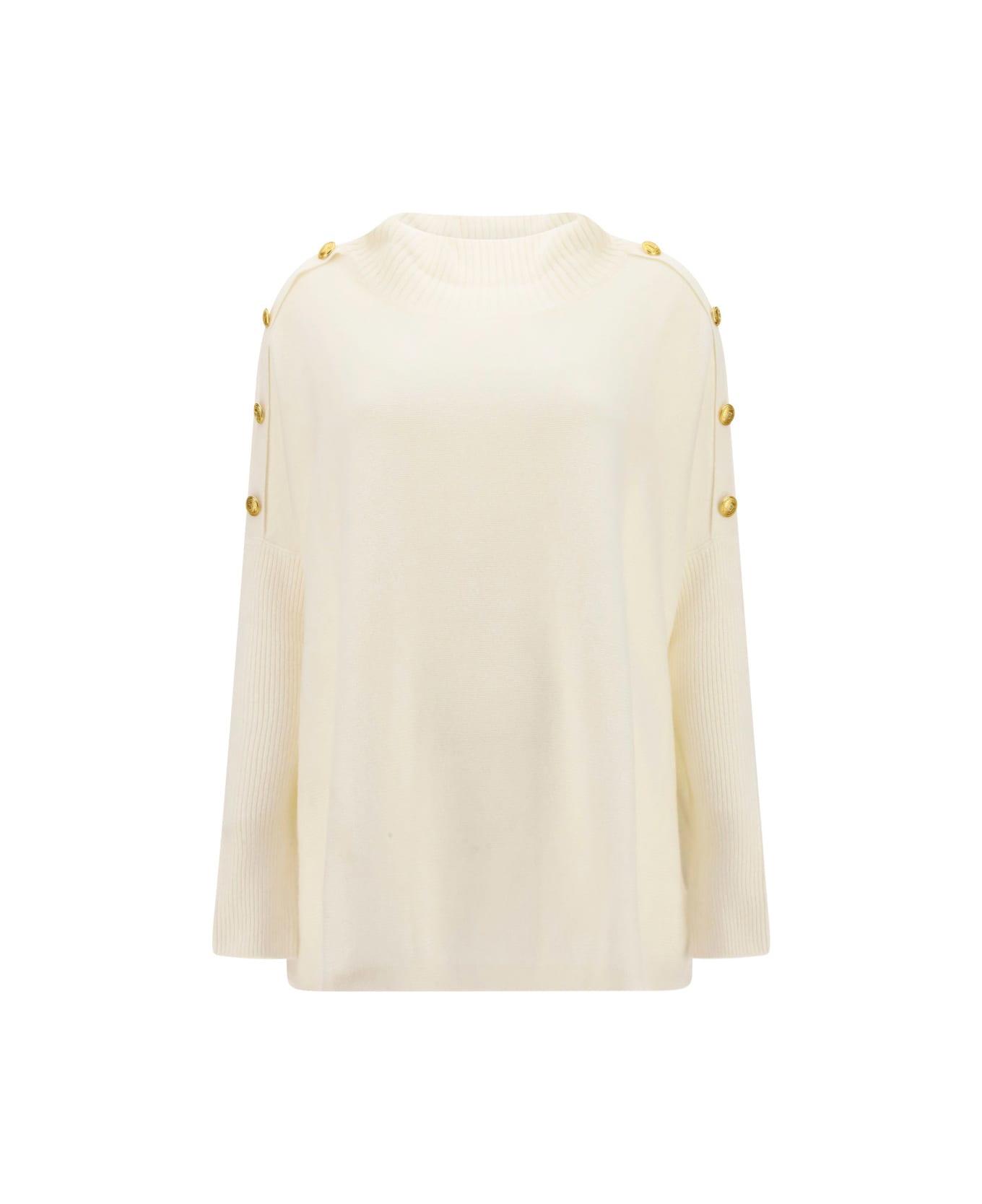 Wool sweater by snobby sheep, ribbed turtleneck, ribbed long sleeves, gold-plated button detail at shoulders, asymmetrical hem, loose silhouette.