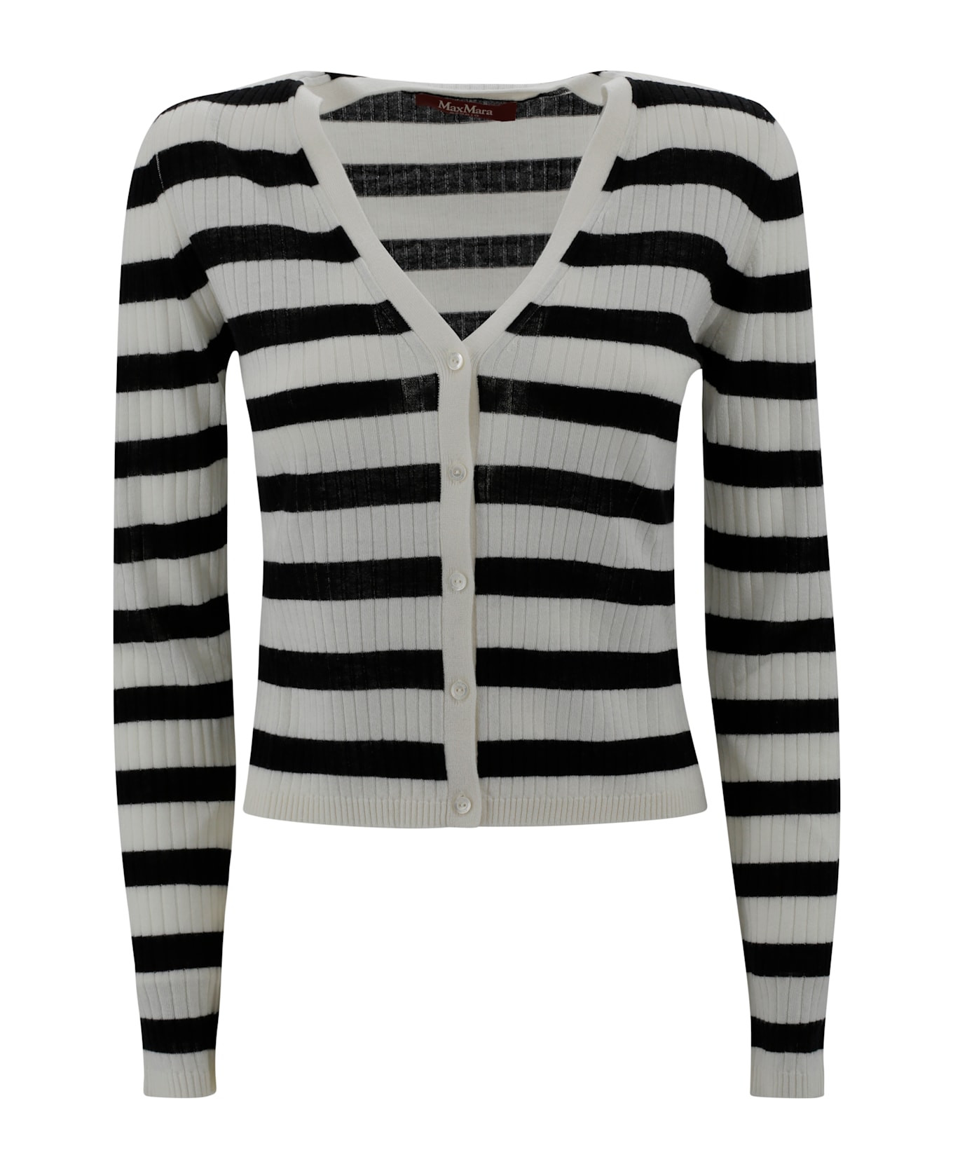Long-sleeved cardigan made of fine wool-silk yarn worked in striped flat rib. Fitted and feminine fit model with V-neckline and ribbed edges. Front closure with small mother-of-pearl buttons.
