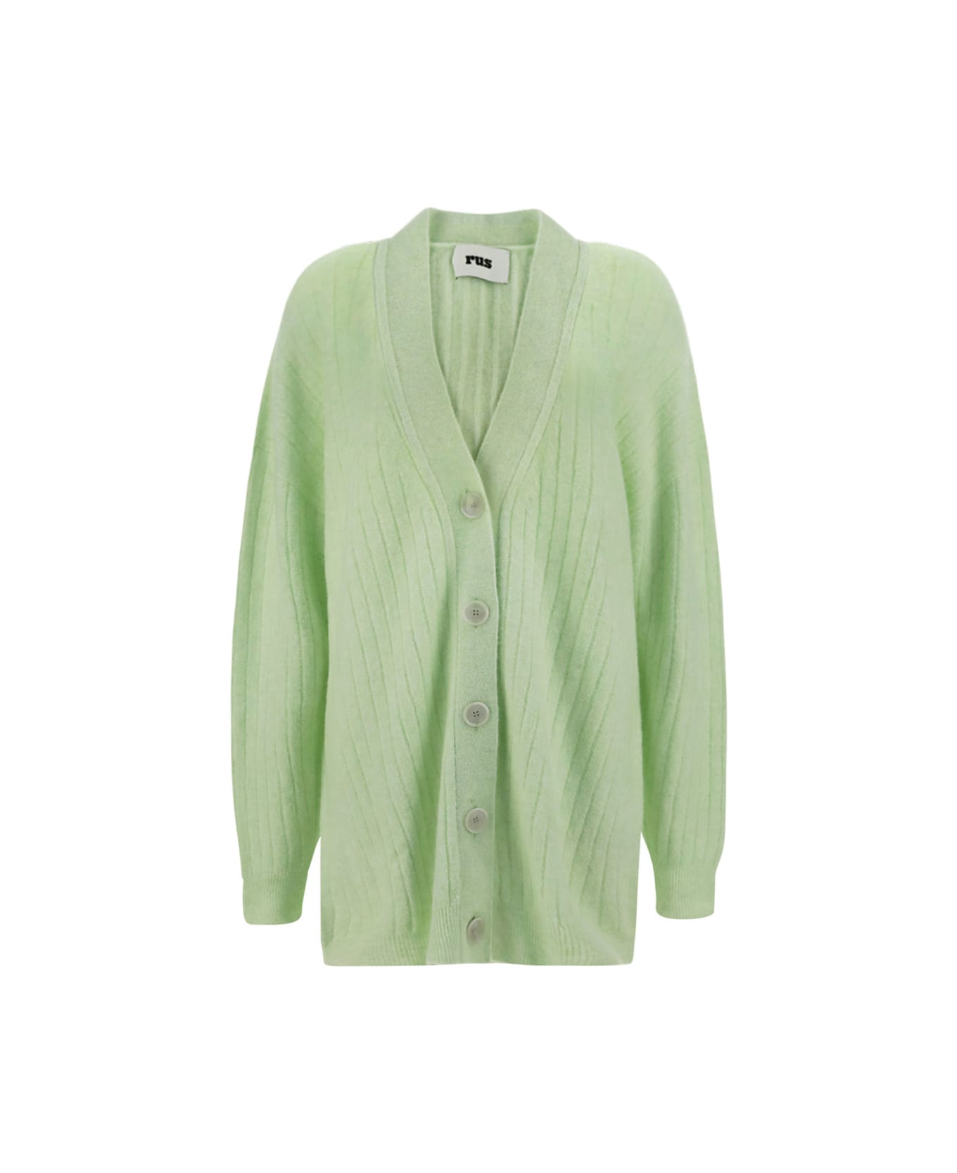 Wool tsuki cardigan by rus, tone-on-tone front button closure, v-neck on front, all-over ribbed design, oversize fit. Composition: 38% % Nylon, 36% % Merino Wool, 25% % Alpaca, 1% % Rubber